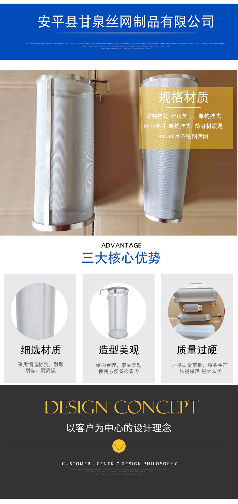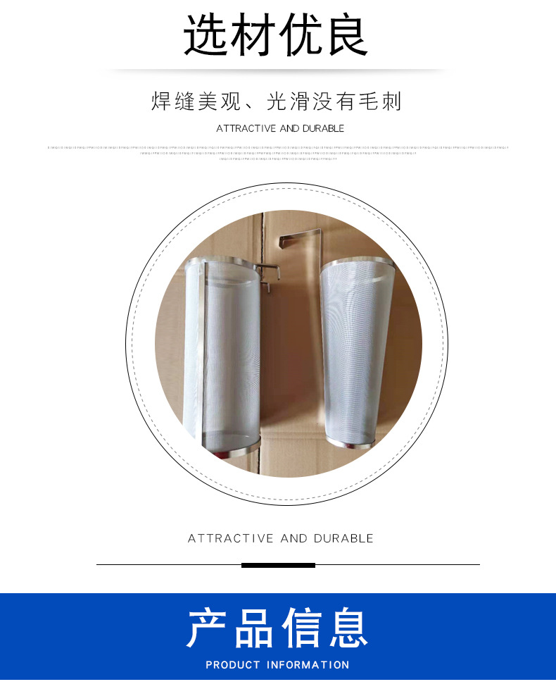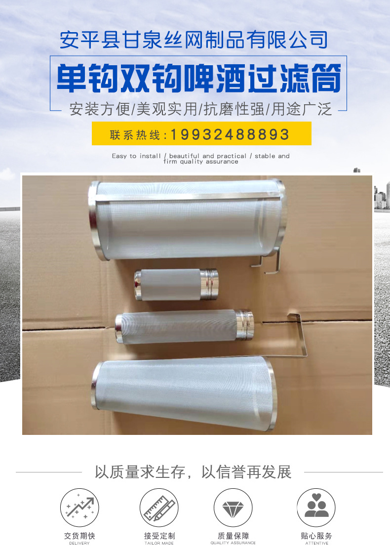 安平县甘泉丝网制品有限公司 河北省安平县甘泉丝网制品有限公司是家丝网的生产厂家。 工厂座落于丝网之乡---安平县。工厂几经发展,不断更新设备,扩大规模,改进生产工艺和品种创新,现能生产各种丝网产品 主要生产经营不锈电焊钢网、不锈钢过滤网、不锈钢筛网、 啤酒过滤网筒; 咖啡过滤网片; 烟斗过滤网片; 过滤网帽;气液过滤网 和不锈钢金属丝网加工过滤产品。 我公司以“质量求生存 创新求发展 诚信求市场 服务求满意”为企业发展宗旨。 公司精神:诚信、创新、荣誉、务实!公司宗旨以诚信为根本,以服务求生存。欢迎广大客户来厂参观订购,本公司将以优惠的产品,低的价格,贴心的服务竭诚与您合作! 我公司拥有完整、科学的质量管理体系。我公司的诚信、实力和产品质量获得业界的认可。欢迎各界朋友莅临参观、指导和业务洽谈。