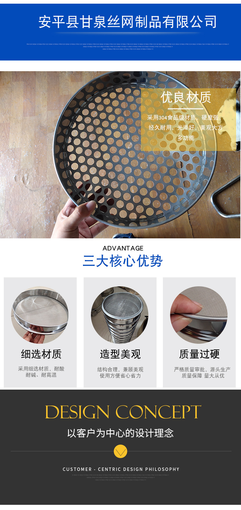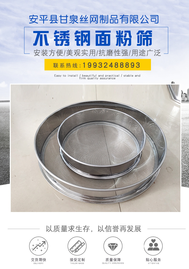 安平县甘泉丝网制品有限公司 河北省安平县甘泉丝网制品有限公司是家丝网的生产厂家。 工厂座落于丝网之乡---安平县。工厂几经发展,不断更新设备,扩大规模,改进生产工艺和品种创新,现能生产各种丝网产品 主要生产经营不锈电焊钢网、不锈钢过滤网、不锈钢筛网、 啤酒过滤网筒; 咖啡过滤网片; 烟斗过滤网片; 过滤网帽;气液过滤网 和不锈钢金属丝网加工过滤产品。 我公司以“质量求生存 创新求发展 诚信求市场 服务求满意”为企业发展宗旨。 公司精神:诚信、创新、荣誉、务实!公司宗旨以诚信为根本,以服务求生存。欢迎广大客户来厂参观订购,本公司将以优惠的产品,低的价格,贴心的服务竭诚与您合作! 我公司拥有完整、科学的质量管理体系。我公司的诚信、实力和产品质量获得业界的认可。欢迎各界朋友莅临参观、指导和业务洽谈。