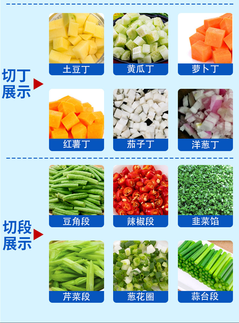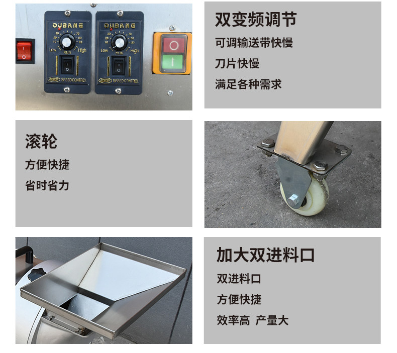 ③通过更换刀盘或者双调频调节输送带与斩刀速度,可以切出各种规格的片、丝、丁;
