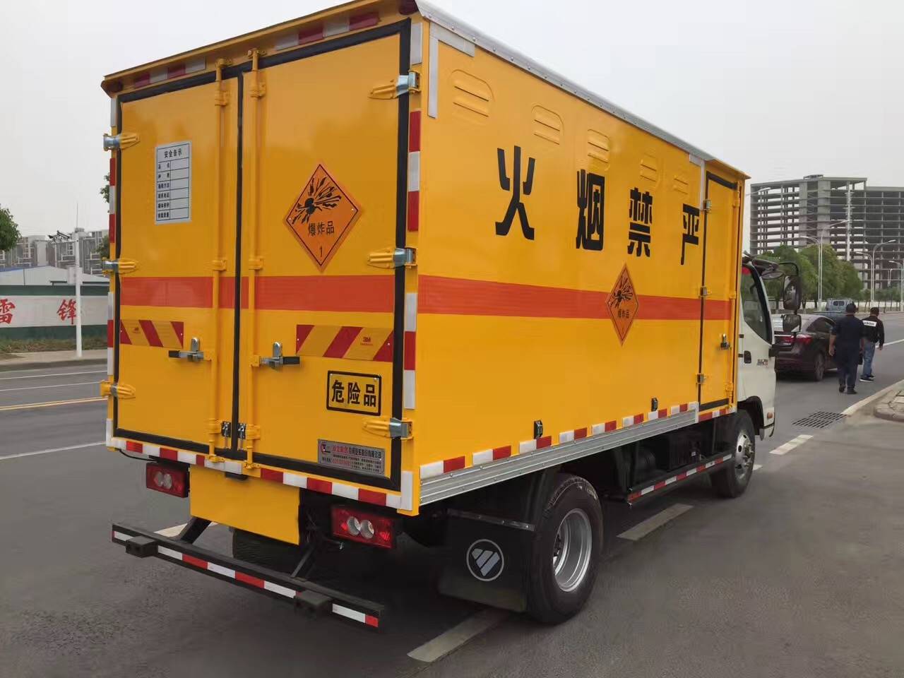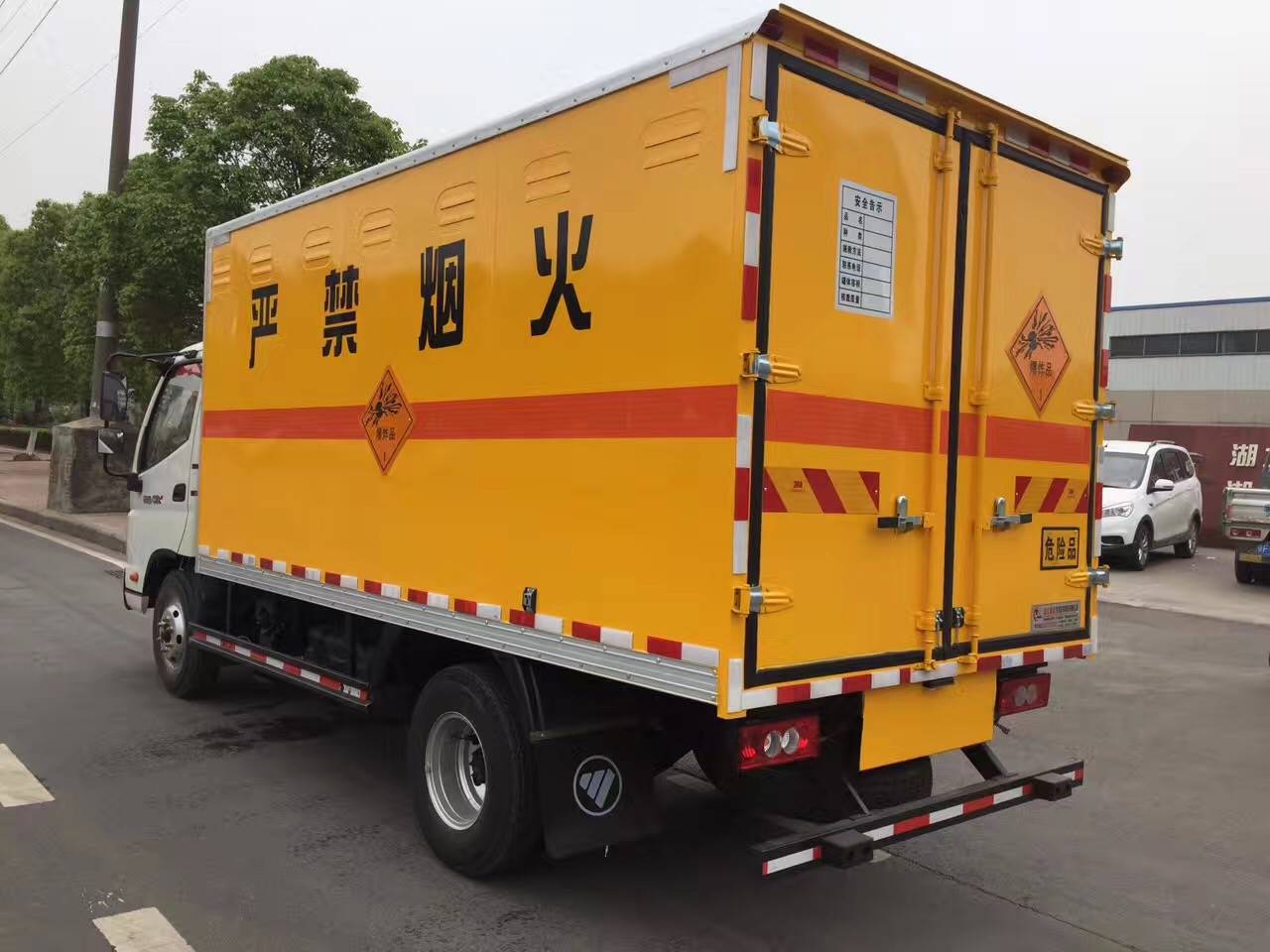 7、车身颜色为黄色,并有“严禁烟火”和“爆”字样,贴有反光标识。