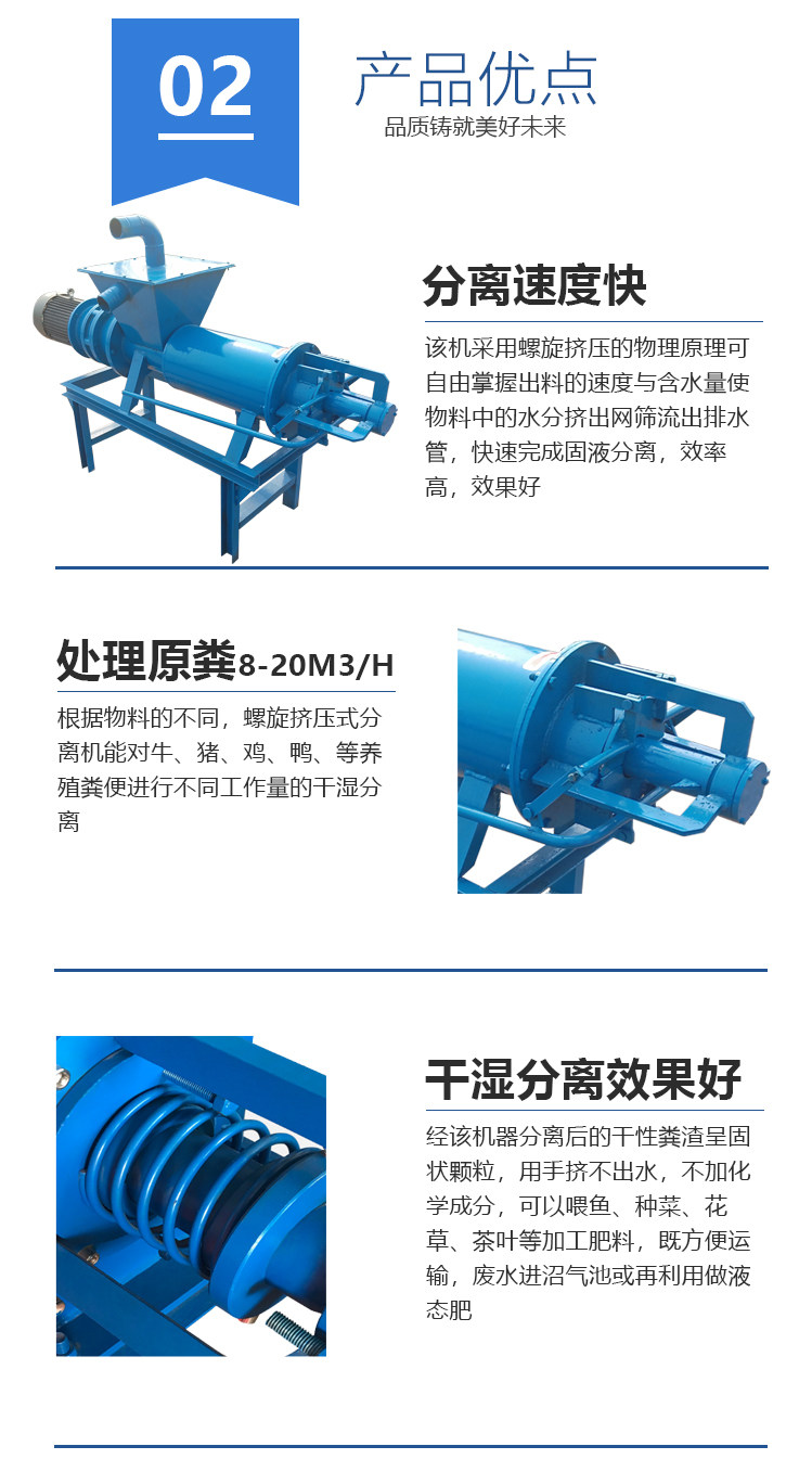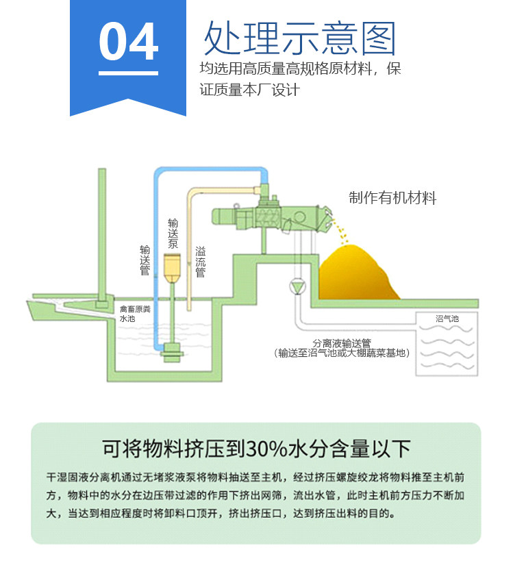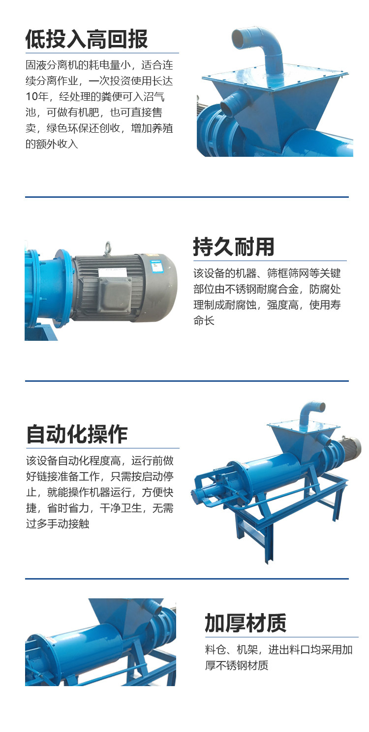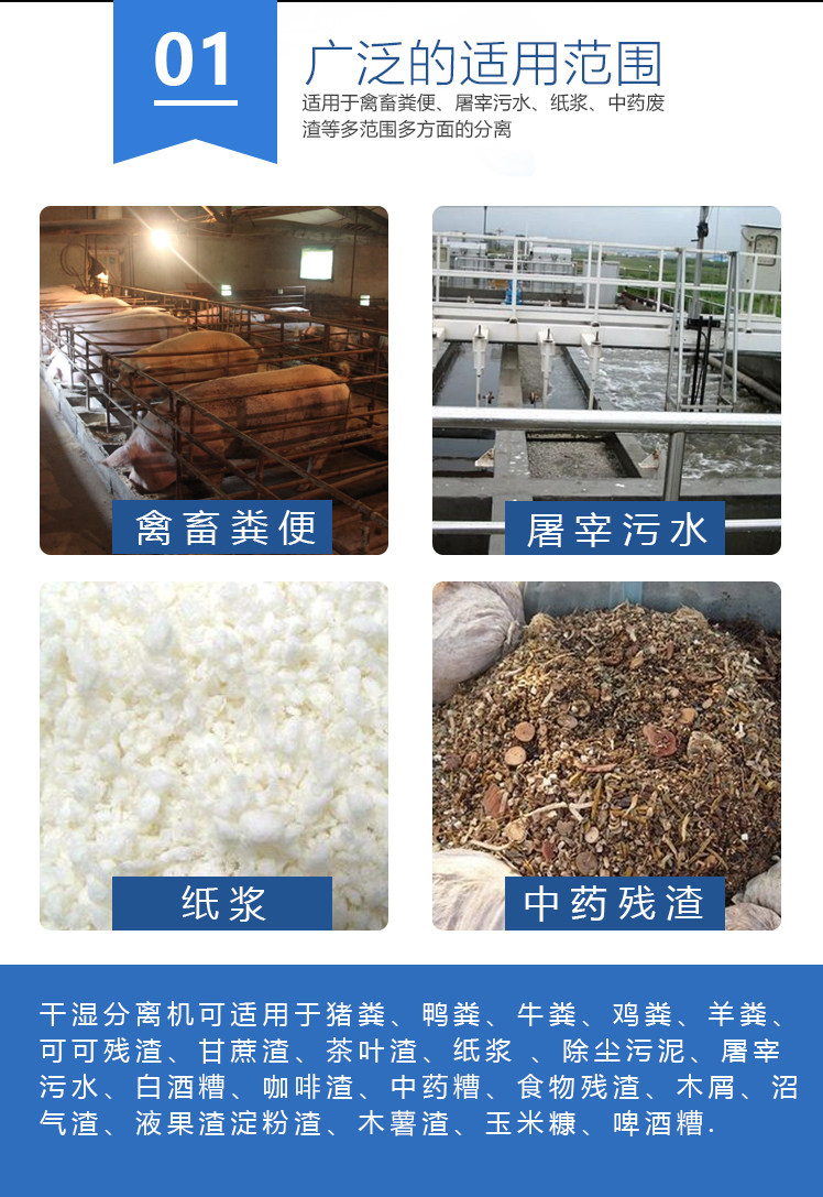 固液分离机,不仅解决了禽畜粪便对养殖场及周边环境的污染,通过处理,也使得禽畜粪便产生很好的经济效益,实现循环经济养殖,也用于有机肥制造企业的禽畜粪便原料脱水处理,目前使用比较广泛的禽畜粪便处理有:猪粪、鸡粪、牛粪、鸭粪及冲刷养殖舍污水。