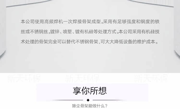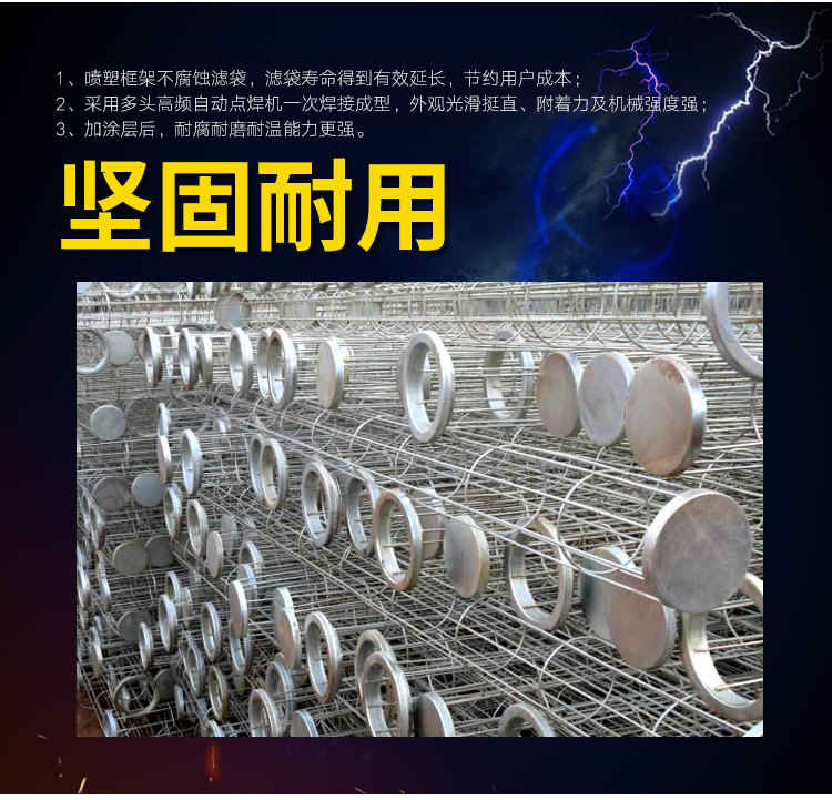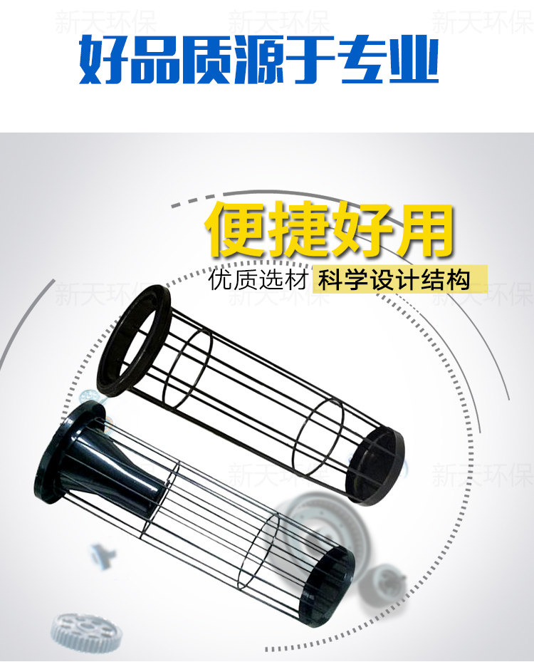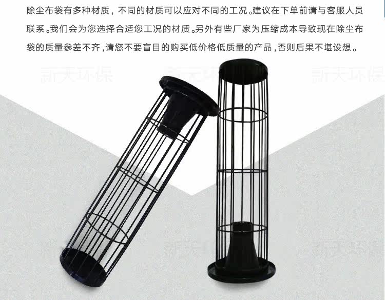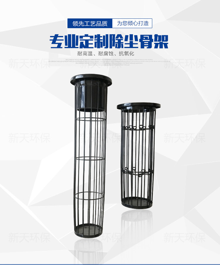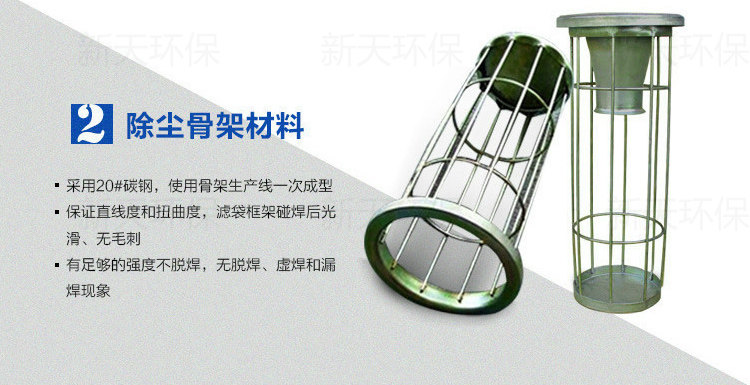 除尘骨架是滤袋的肋骨,它应轻巧,便于安装和维护,骨架的质量直接影响滤袋的过滤状态和使用寿命。本公司运用进口设备生产,产品性能优越,规格齐全,制造的每一只骨架都能符合轻巧、光滑、挺直的要求;设计结构坚硬,使用寿命长;可根据客户需要特制。