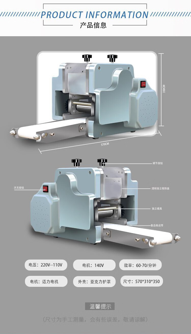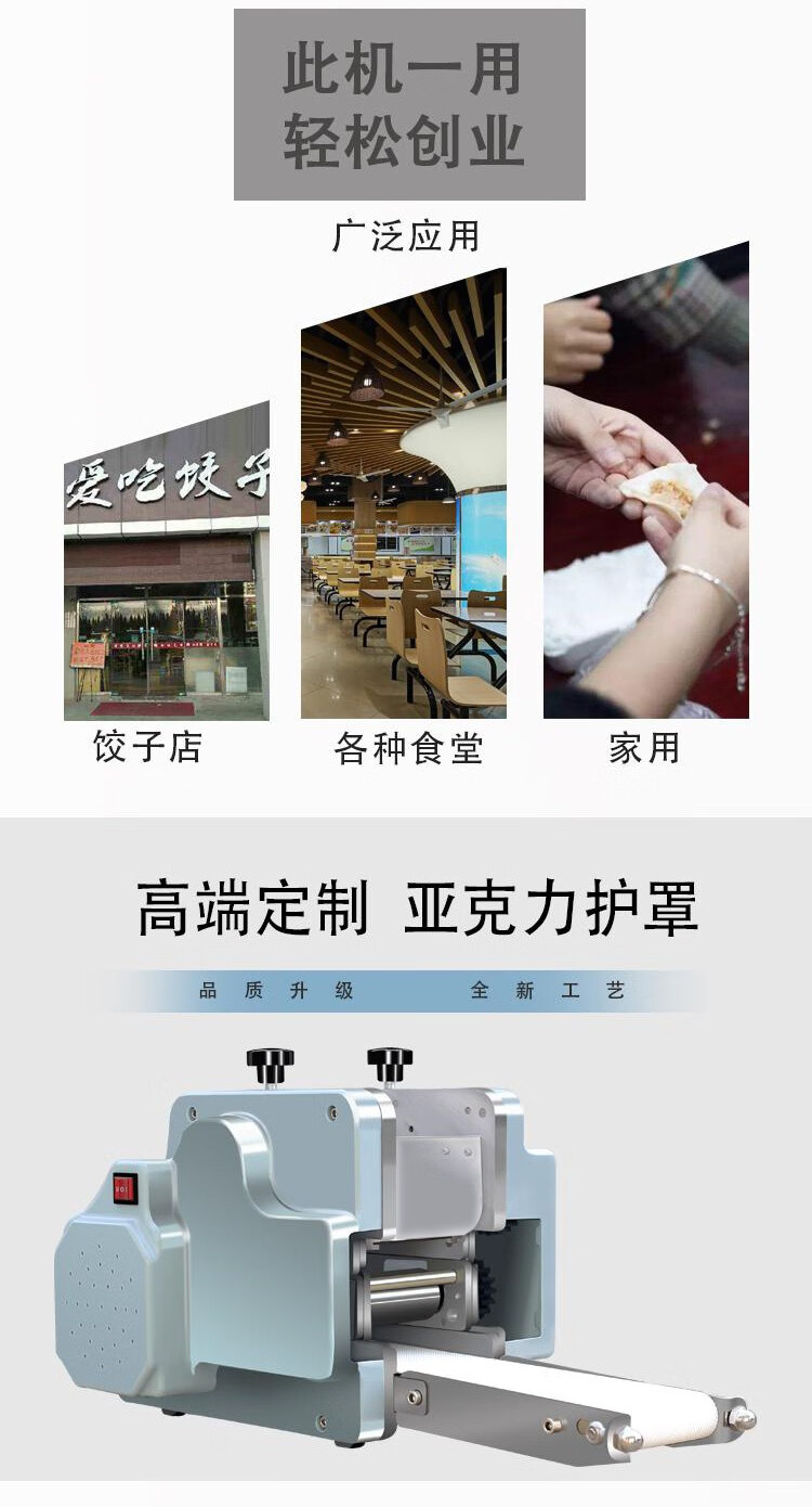 新型仿手工饺子皮机撒粉均匀,不粘皮,中间厚边缘薄,结构简单,欢迎使用。仿手工饺子皮机具有高效节能、安全卫生、无边角废料、大小厚薄可变等优点,使所生产饺子在外观、口感、重量达到空间统一,从而彻底改变了目 前生产效率低、员工浪费、二次污染、中部裂口等现状,小型机器,大大功效,欢迎选购。用起来简单方便,效果好,口感好。饺子皮机机身小,功能大,成本低,质量保证,售后放心,材质优选,放心购买。支持定制,多种形状,多种型号,任你选择,欢迎使用,欢迎来电咨询商品详情。