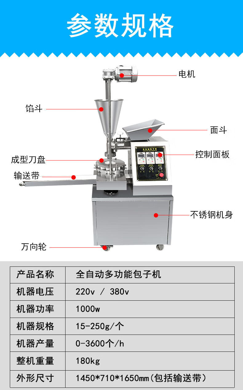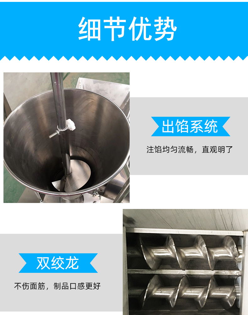 5、自动化程度高,定量准确,制品大小一致,皮馅比例20克-150克,随意可调,1-2人即可操作。