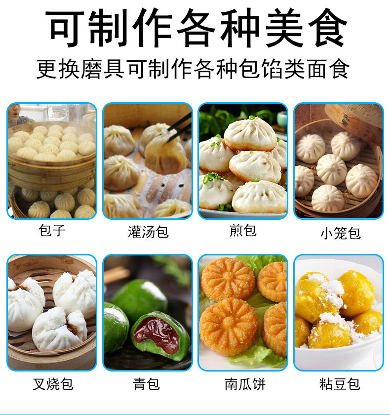6、包子机产品多样化,可生产各种包子、南瓜饼、小笼包、绿豆饼、豆沙包等各种包馅产品。