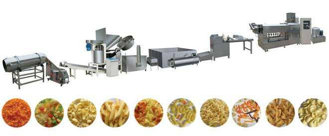 拌粉机→双螺杆膨化机→切断机→自动油炸机→八角筒→(包装机