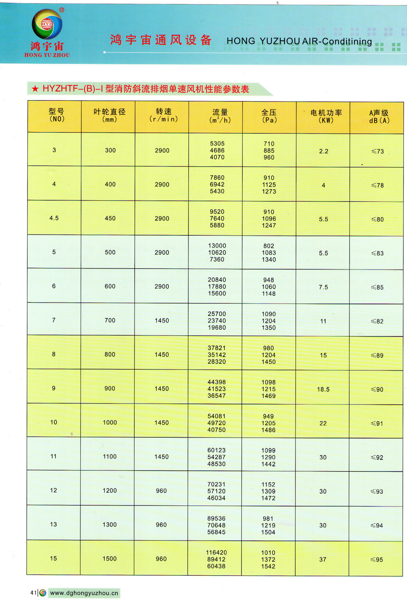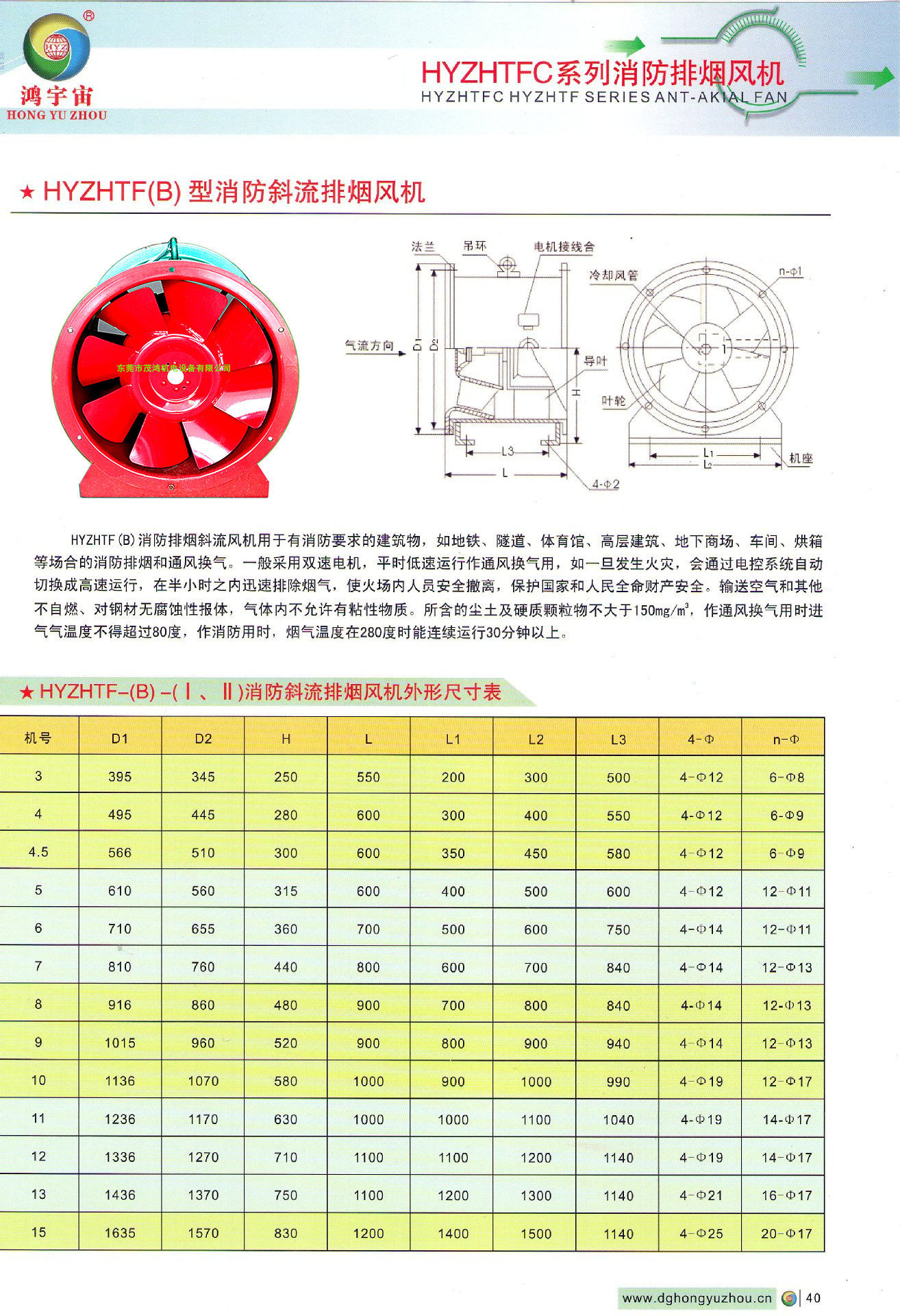 HTF-B 消防斜流式排烟风机用于有消防要求的建筑物,如地铁、隧道、体育馆、高层建筑、地下商场、车间、烘箱等场合的消防排烟和通风换气。一般采用双速电机,平时低速运行作通风换气用,如一旦发生火灾,会通过电控系统自动切换成高速运行,在半小时之内迅速排除烟气,使火场内人员安全撤离,保护国家和人民全命财产安全。输送空气和其他不自燃、对钢材无腐蚀性报体,气体内不允许有粘性物质。所含的尘土及硬质颗粒物不大于150mg/m3,作通风换气用时进气气温度不得超过80度,作消防用时,烟气温度在280度时能连续运行30分钟以上。