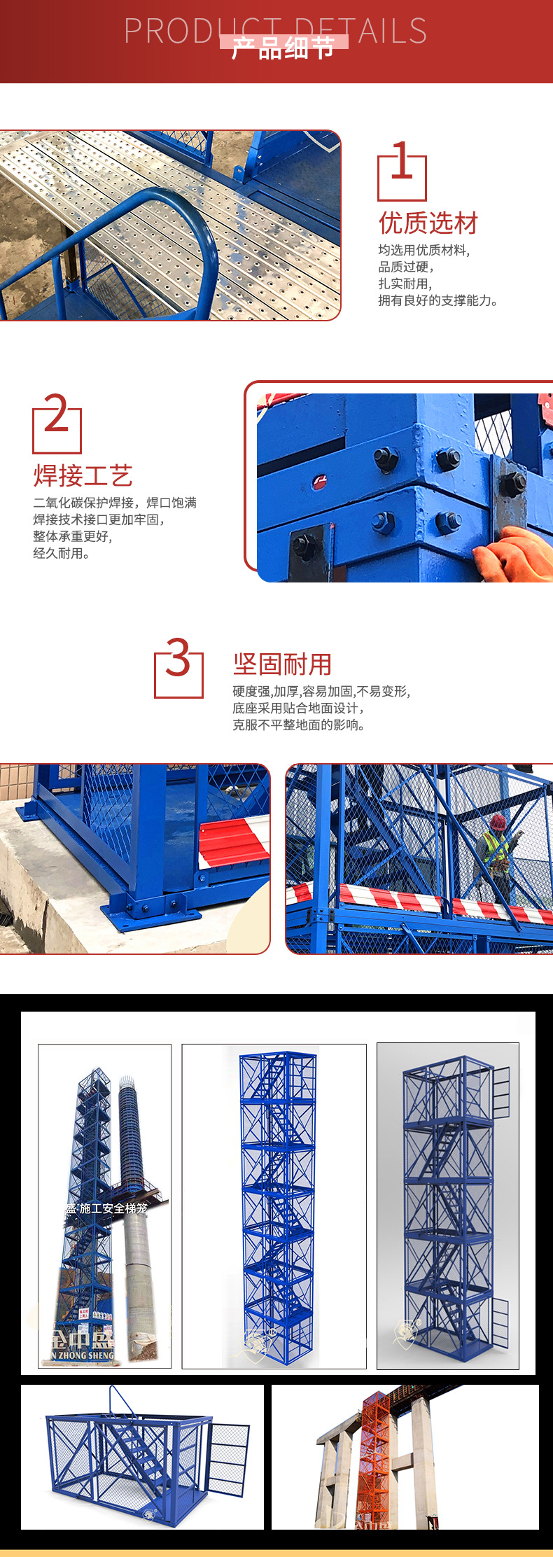 本产品全部由钢结构拼装而组成, 主要构件平台、 接梯等均主要采用焊接工艺, 构件四面独立形成围护体系。钢材采用标准型材,制作严格按图施工,尺寸正确, 焊接牢固,达到安全防护之目的。