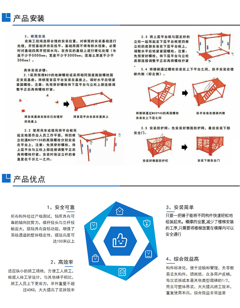 技术参数 模块化施工梯笼有两种规格:规格一:3000MM*2000MM,规格二:3600MM*2000MM。立柱采用75*6的角钢结实稳固,楼梯钢板采用3MM厚度花纹板。