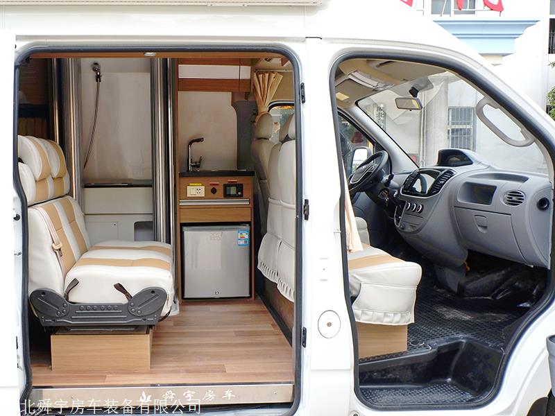 在左侧呢,也就是主驾驶的后方,是餐厨区,上层是一个洗菜池,下面是一个抽拉的800W电磁炉,煮水饺、面条等,毫不费力。底层就是50L的直流房车专用冰箱,路途中保证了食材的新鲜,是不是配置很可以呢!