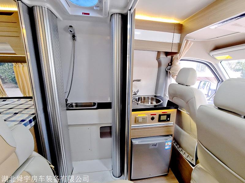 双人座椅的左侧就是整个车的卫生间啦,搭配的舜宇专用的卷帘门式设计,既节省空间,又无形中增大了整个会客区的空间。除了常规配置的化妆镜、铝合金毛巾架、抽拉式淋浴喷头,肥皂盒等物品,还搭配便携式马桶,使用方便又给淋浴足够的空间,搭配80L清水和30L污水,尽情使用。大部分短轴车内,没有比舜宇做的更大的淋浴空间了!顶置换气扇,保证了使用时,卫生间内的空气流通。湖北舜宇房车专注房车私人定制,卫生间可选择固定式的,可选择卷帘式的,还可以选择抽拉式的,满足不同的喜好和需求。