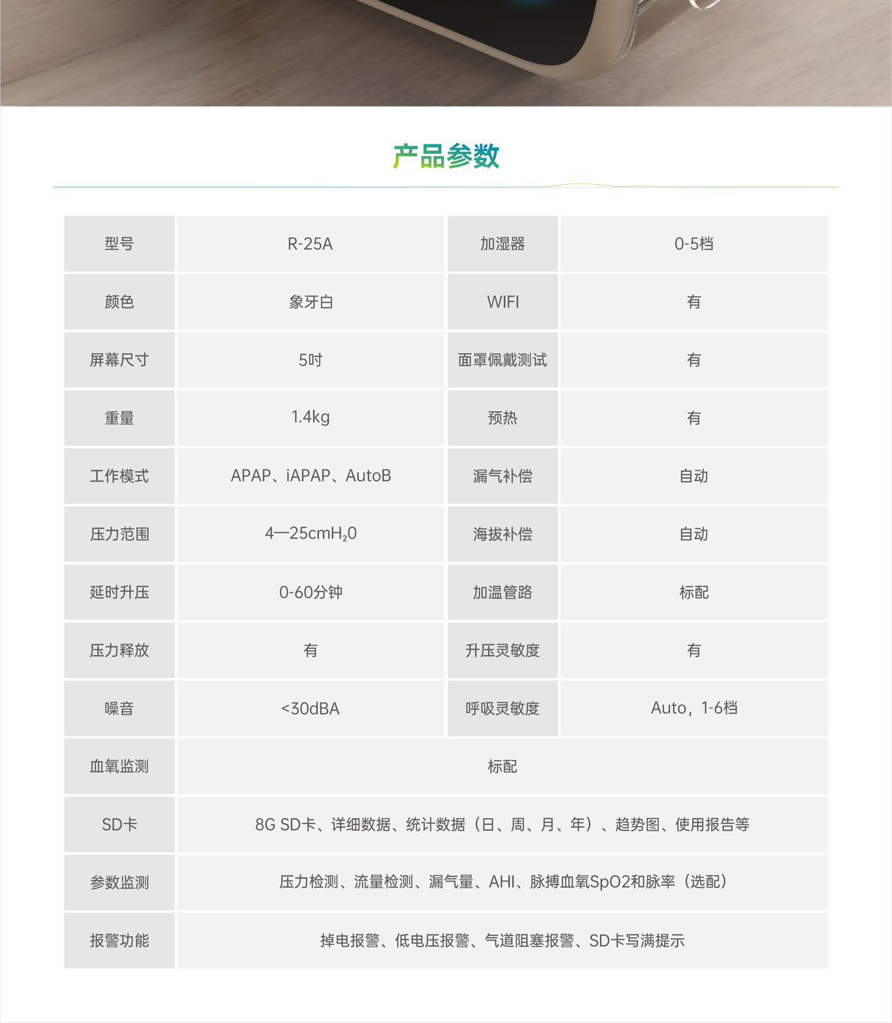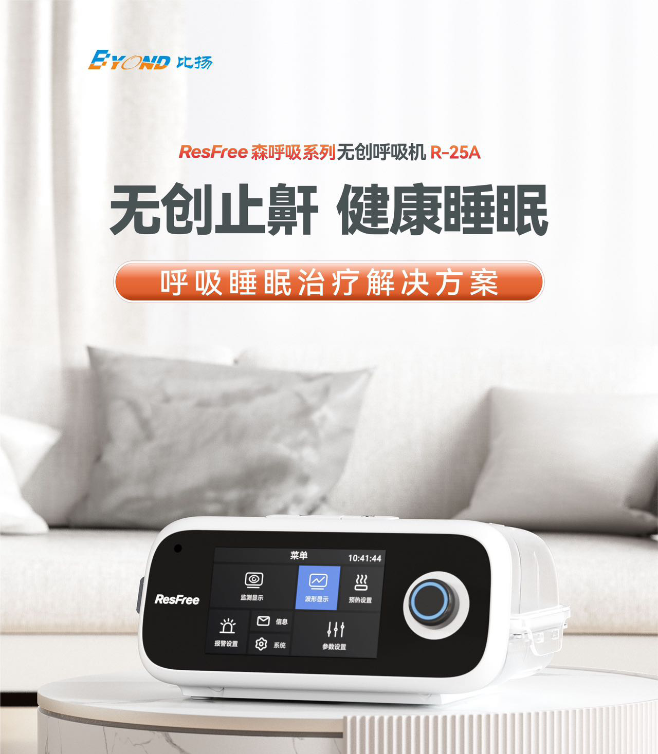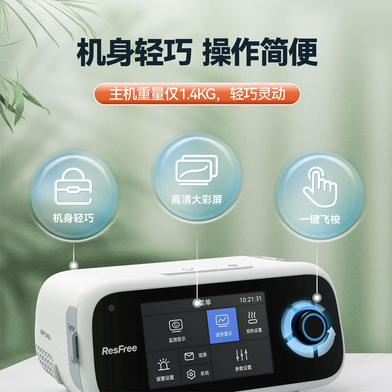 产品介绍:比扬森呼吸R-25A是一款家用睡眠呼吸机,压力范围:4-25cmH2O,标配加温管路,云端互联,标配血氧模块。