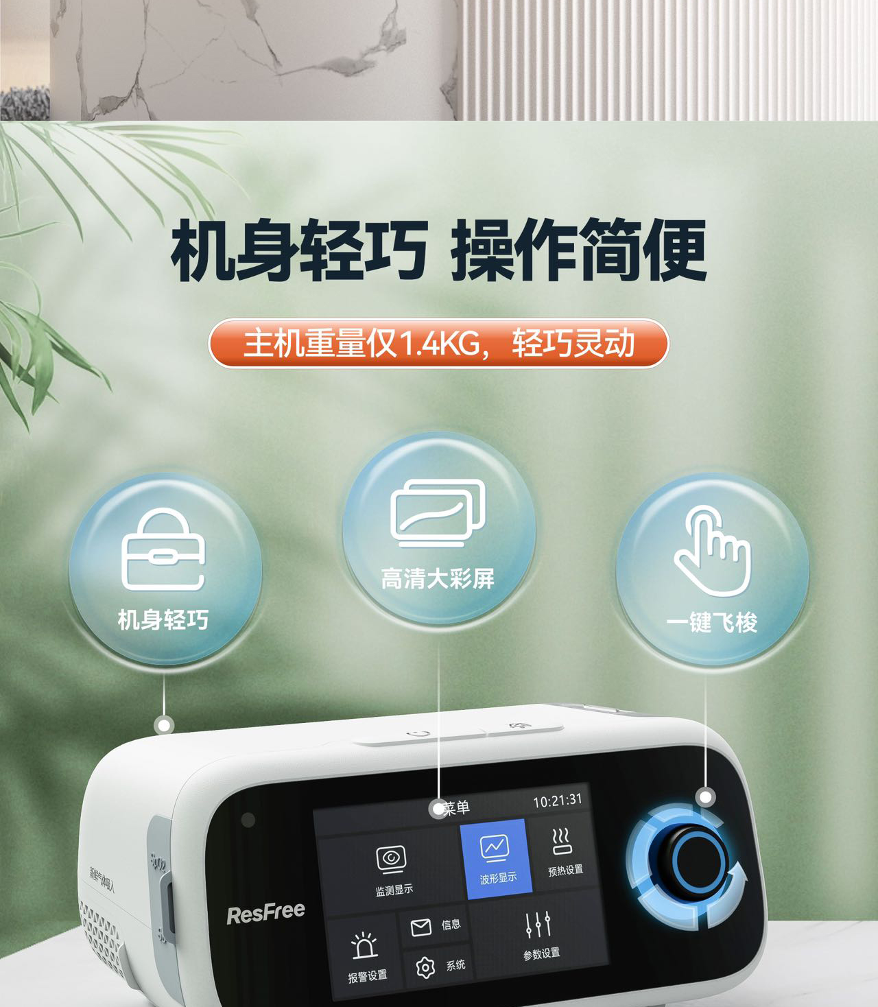 1. 5吋高清大彩屏,一键启动,UI界面全新升级,人机交互简单易懂,直观清晰,老人一用就懂。主机仅1.4kg,机身轻巧灵动。