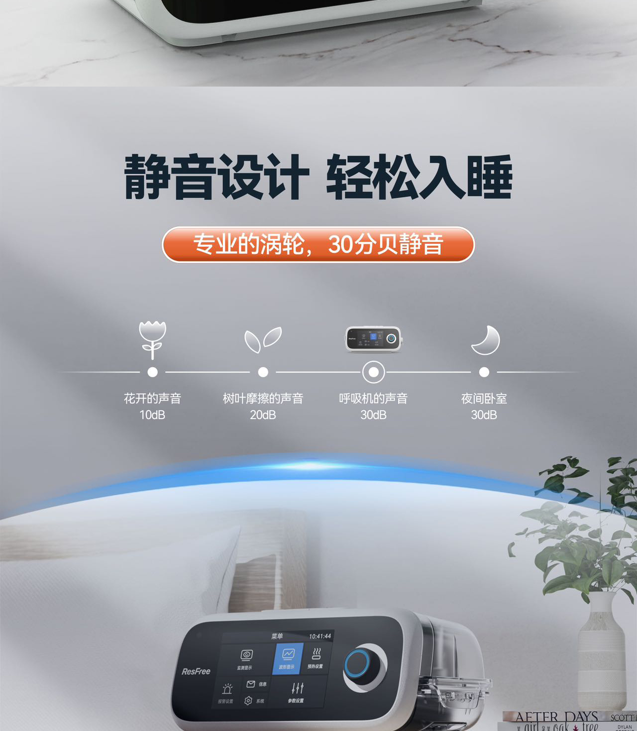 2. 小于30分贝静音设计,轻松入睡。主机水管一体化,防倒流设计。