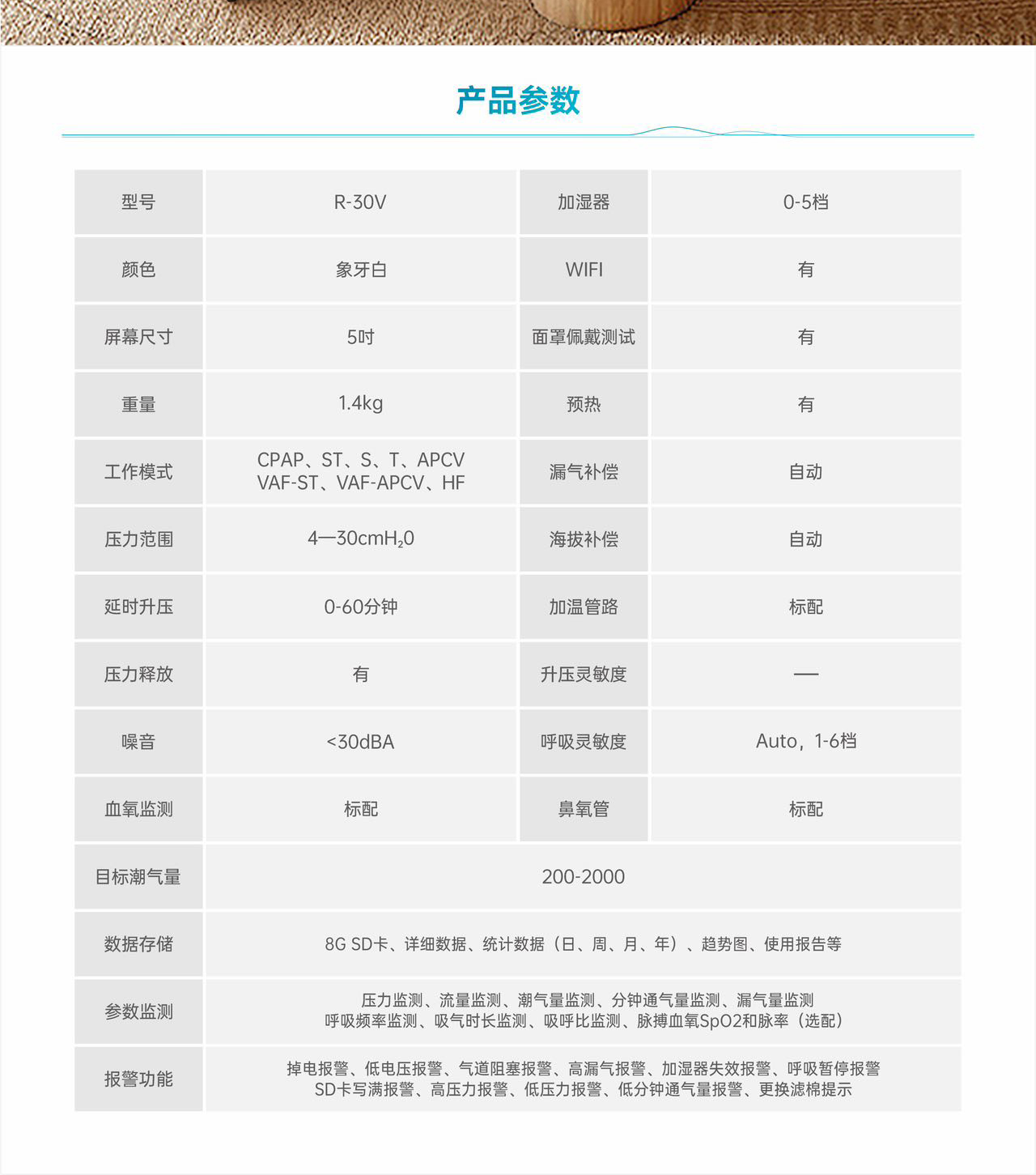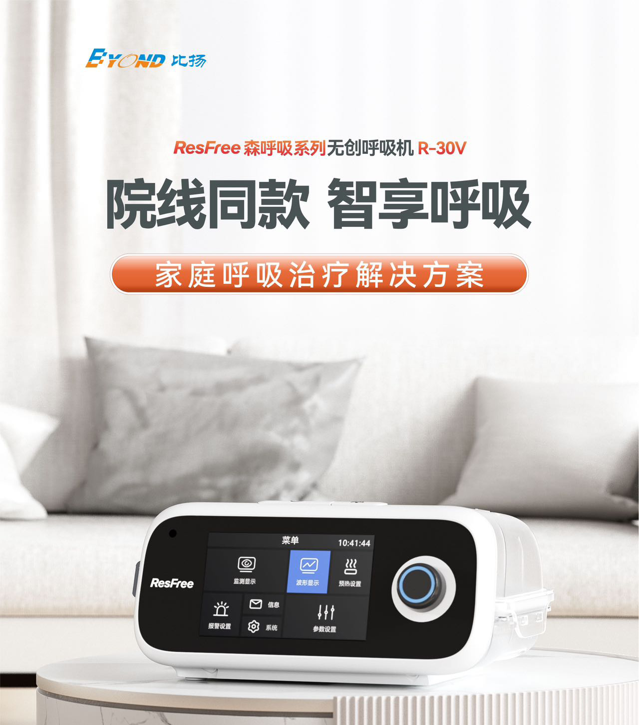 比扬森呼吸R-30V是一款家用肺病呼吸机,压力范围:4-30cmH2O,云端互联,标配血氧模块,标配加温管路,高流量模式一机两用。