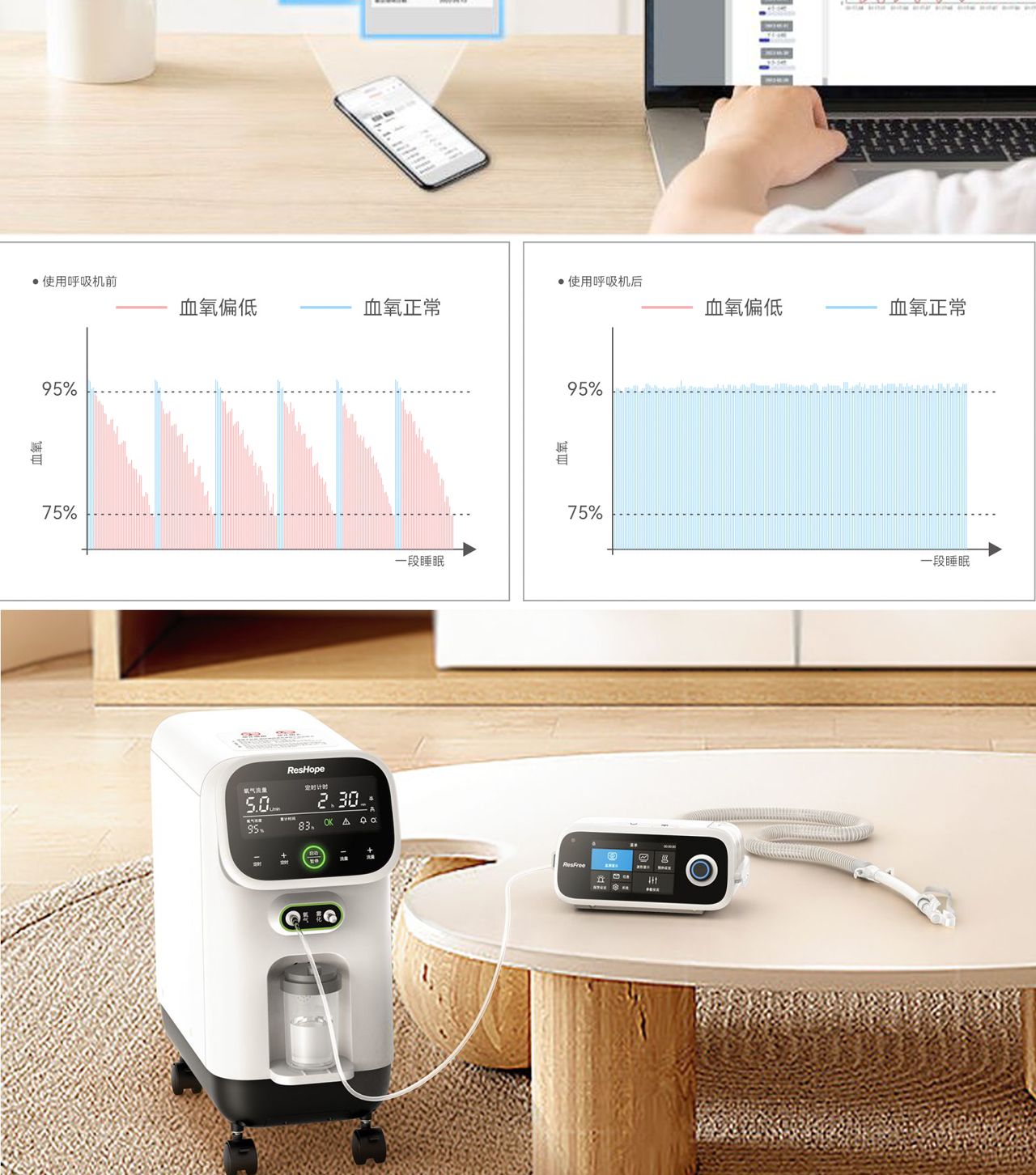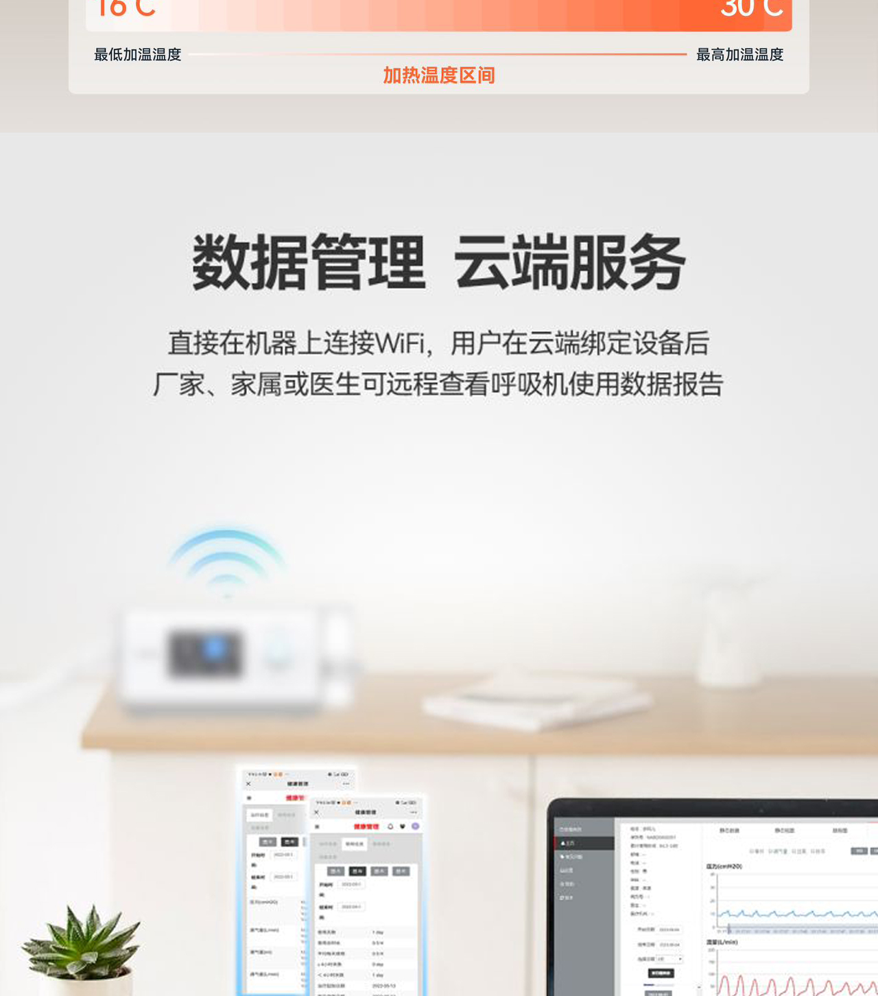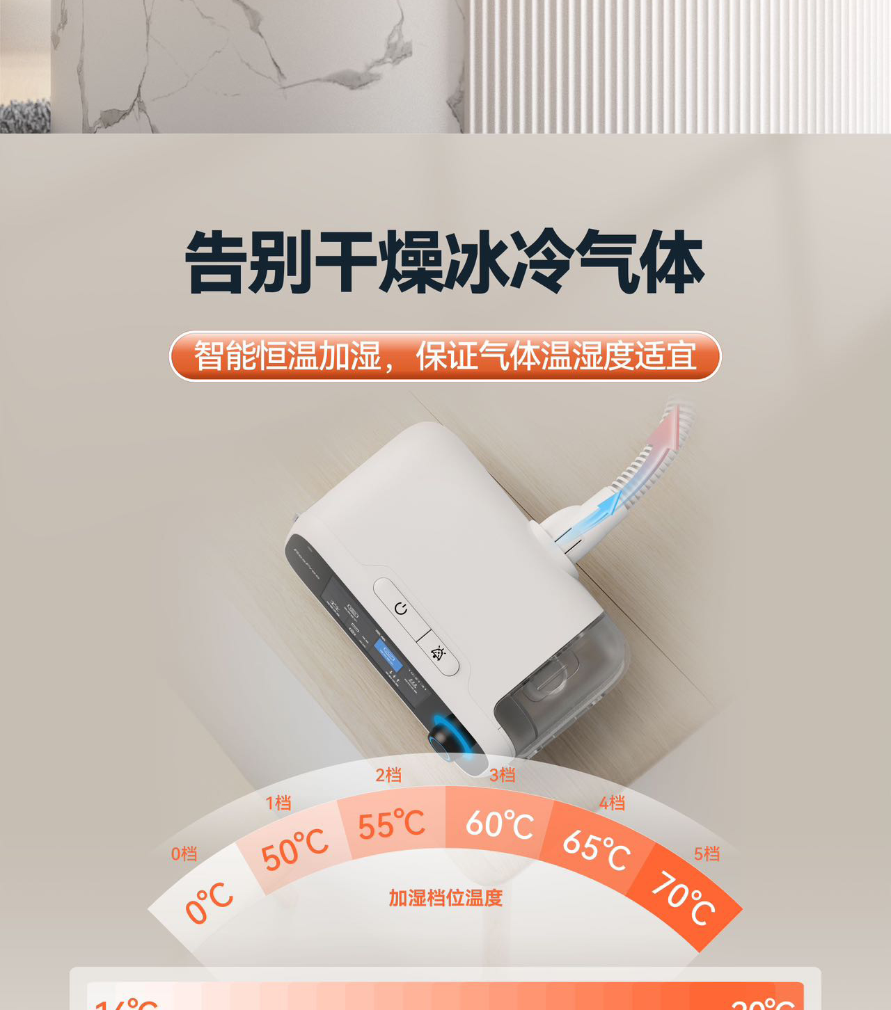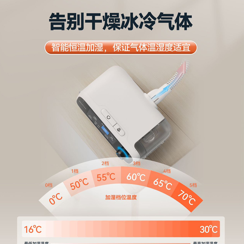 1.标配加温管路,减少冷凝水,提升湿化效果,配合提前预热功能,保证输出气体温度恒定适宜,提升用户的舒适度。