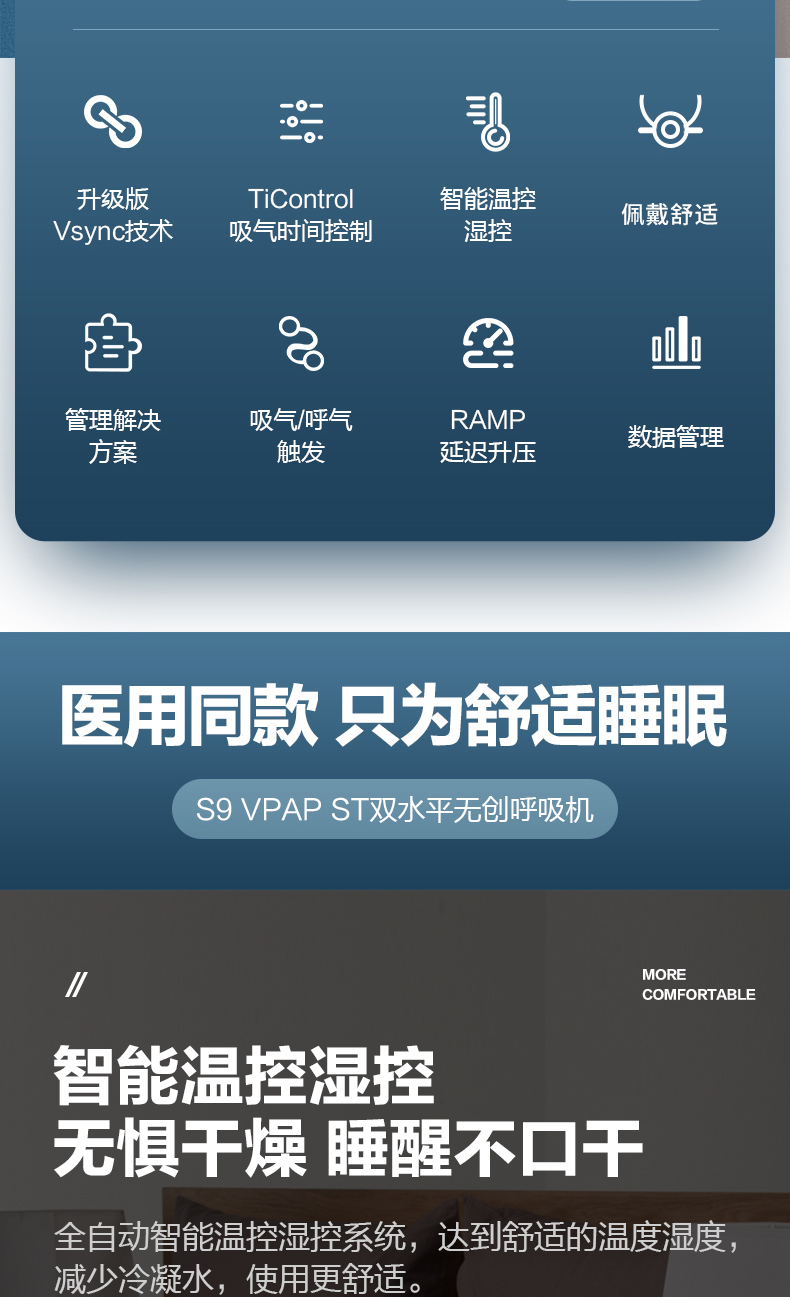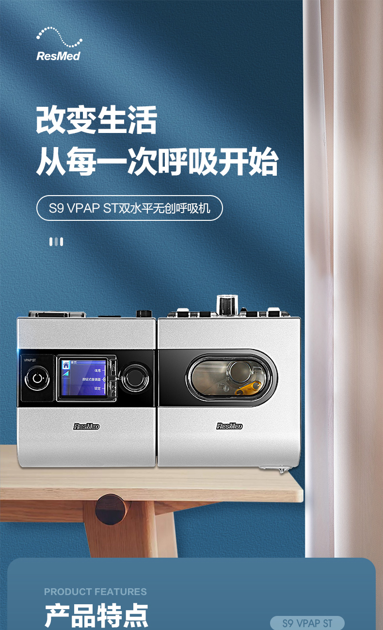 瑞思迈S9 VPAP ST呼吸机是一款专为肺病患者设计的先进设备,提供了多种创新功能,以确保患者的舒适性和改善效果。以下是这款呼吸机的五大亮点: