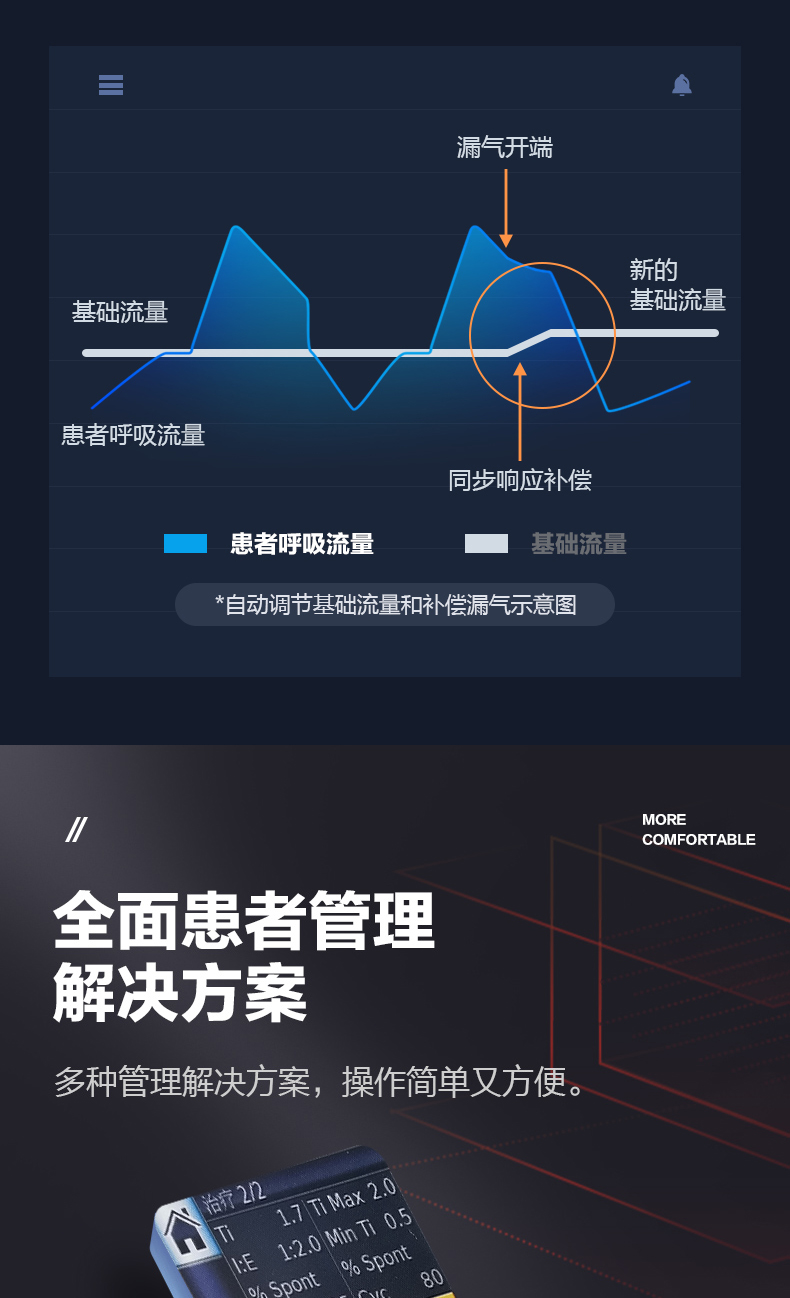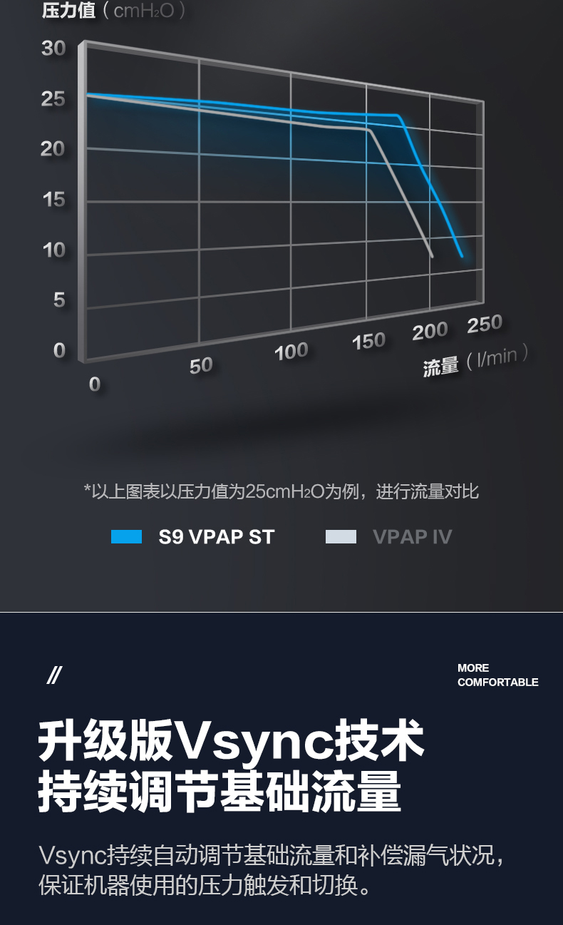 VSync技术能够实时监测漏气的动态变化,并准确补偿快速变化的不稳定泄漏。这种技术能够在正确的时间提供正确的流量,从而确保可靠的呼吸触发和人机同步性,提供标准的漏气补偿,提高治疗的有效性和舒适性。