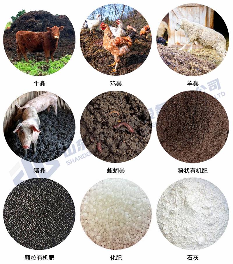 各种干湿粪肥(鸡粪、牛粪、羊粪、猪粪、蚯蚓粪、鸭粪、兔粪等)、有机肥(粉状有机肥、颗粒有机肥)、化肥、石灰、沙子、酒糟、糖渣、药渣、煤泥、草种等不同物料