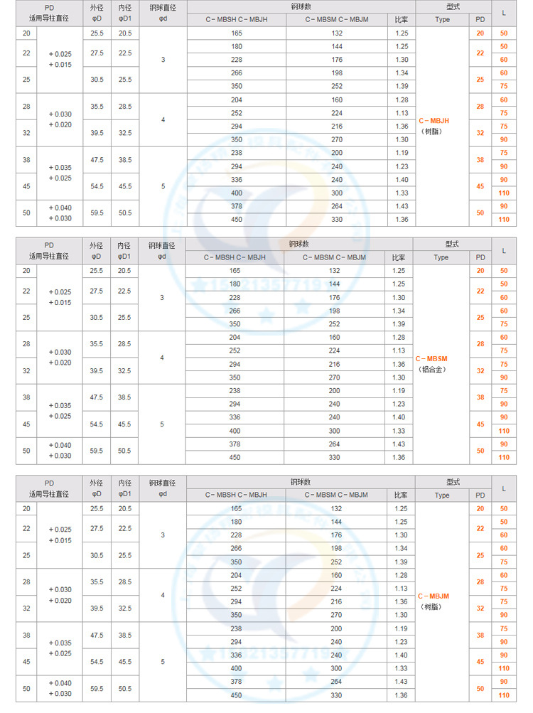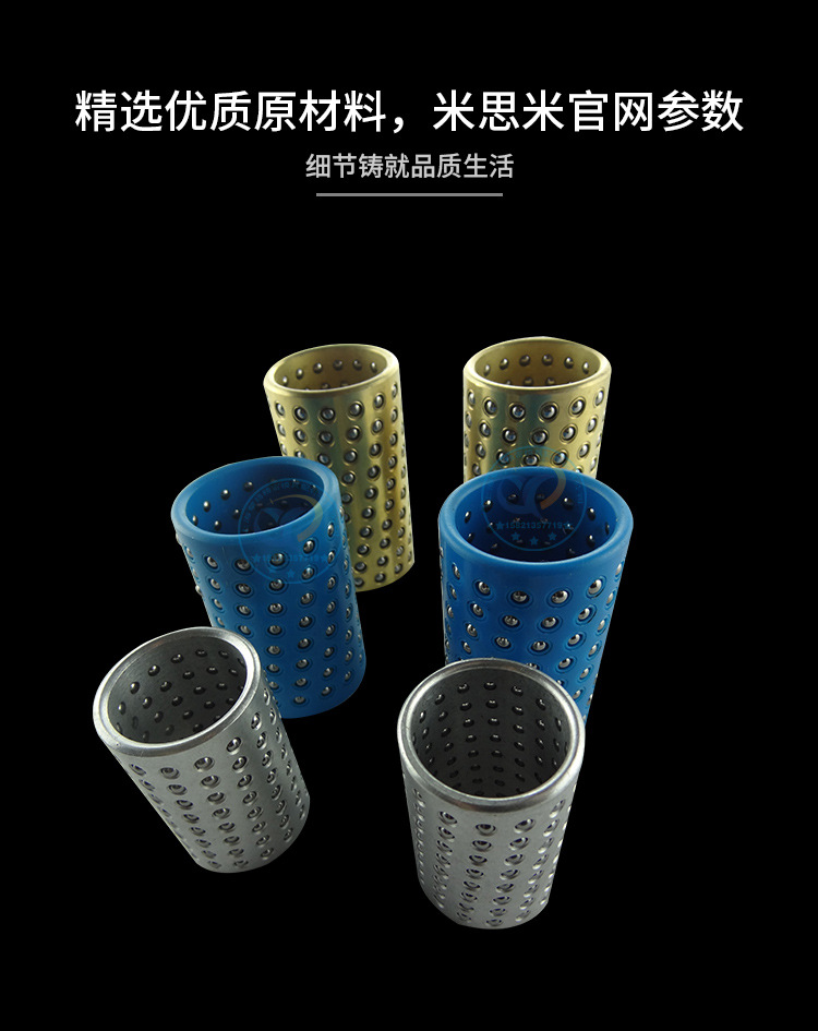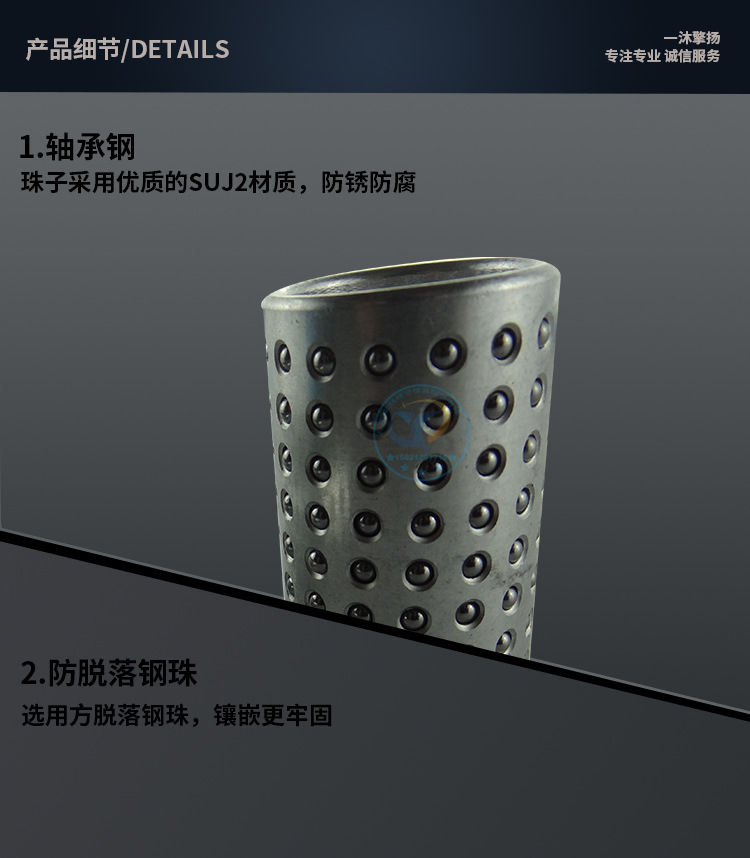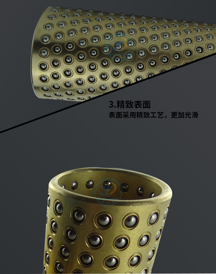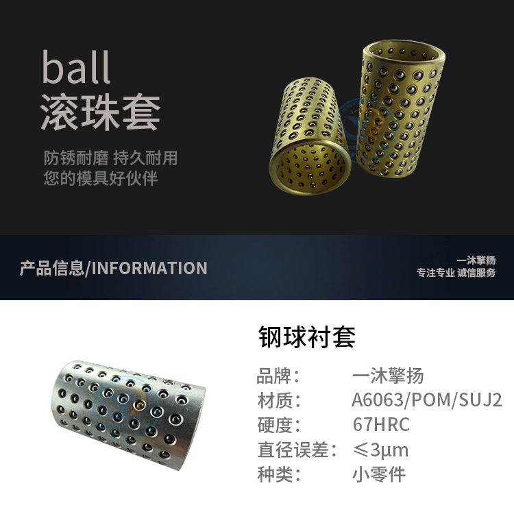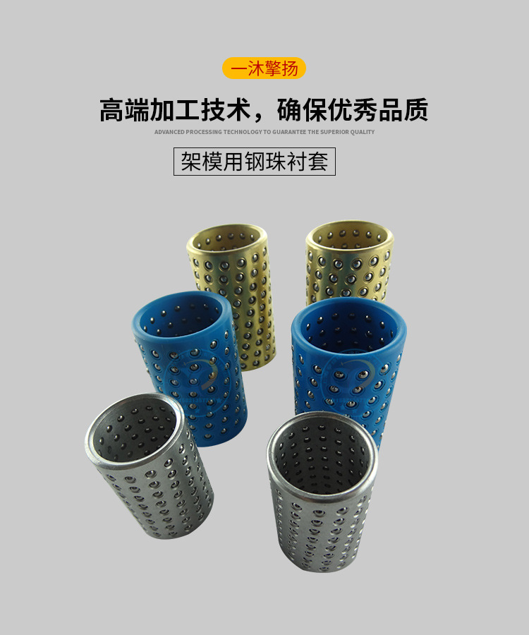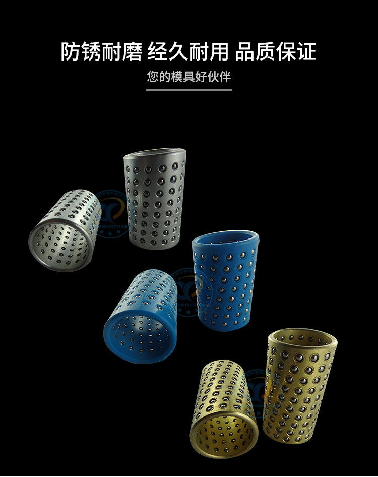 详细描述: 本产品以铜、铝合金、塑胶为基材,高强度精密钢球按一定的角度和密度有序地排列。产品采用新锁珠工艺,防止钢珠抱死、脱落。产品具有摩擦系数低,轴向、径向都能运动的特点,依靠滚动摩擦,实现无间隙装配,保证了使用精度。该产品是传统模具导柱套的更新换代产品,能高速运动,主要用于冷冲模滚动架及高精度机床、机床附件等领域。 传统的具有相对运动的孔与轴是有一定间隙的,并孔与轴之间的运动摩擦系数较大,使用钢球保持圈后,使轴与孔不直接接触,而是中间通过有微量过盈的钢球,因而运动精度高,滚动代替滑动摩擦,滚动灵活,摩擦系数小,使用寿命长,在既有转动,又有移动的场合,用无油或加油的轴套与轴相配,虽然能满足,但运动精密度较低,用滚动轴承,只能满足轴相对对转动的场合,而钢球保持圈,则上述二个条件均满足,目前已广泛应用于冷冲模滚动模架,高精度机床,机床附件以及要求高精度轴向或轴径向同时运动场合。