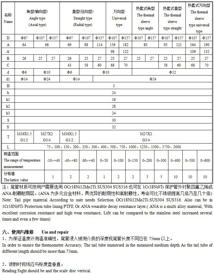 The company's production WSS series Double metal thermometer The protective tube, Section head, The locking bolt Adopt 1Cr18Ni9Ti Material, Case features Aluminum sheet stretch forming Cutting machining Black surface electrophoresis processing, Table with the table box cover Using ring double layer rubber ring Thread sealing locking structure, The meter overall waterproof anti-corrosion performance is good, Radial type instrument Using the pipe type structure, Novel appearance, lightweight, beautiful out of the ordinary.