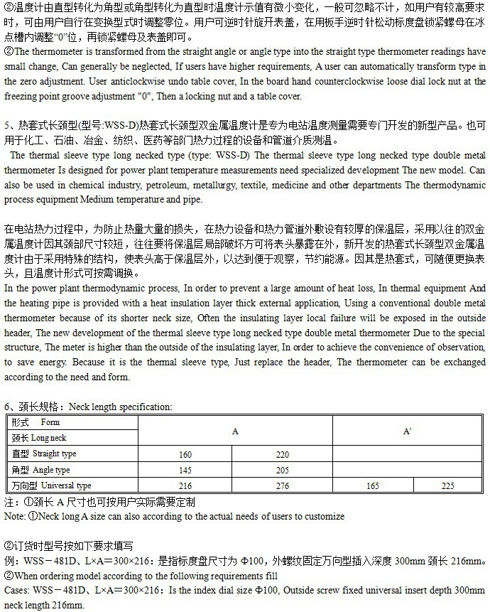 The company's production WSS series Double metal thermometer The protective tube, Section head, The locking bolt Adopt 1Cr18Ni9Ti Material, Case features Aluminum sheet stretch forming Cutting machining Black surface electrophoresis processing, Table with the table box cover Using ring double layer rubber ring Thread sealing locking structure, The meter overall waterproof anti-corrosion performance is good, Radial type instrument Using the pipe type structure, Novel appearance, lightweight, beautiful out of the ordinary.