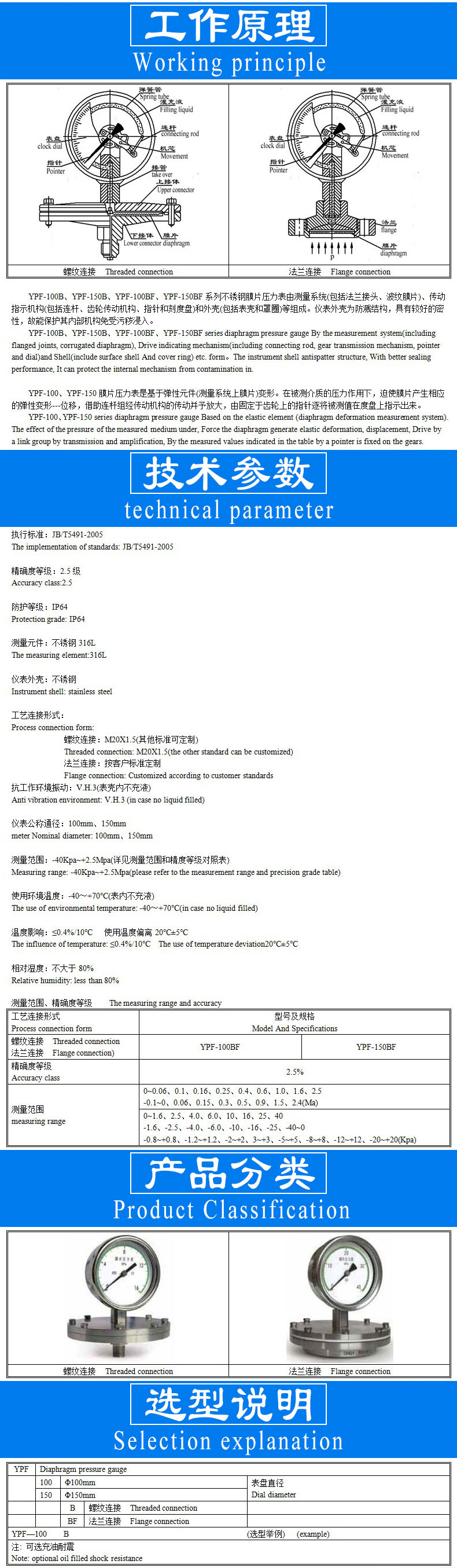 YPF-100B、YPF-150B、YPF-100BF、YPF-150BF系列不锈钢膜片压力表主要用于化学、石油、纺织工业中对气体、液体压力的测量,尤其适用于腐蚀性强、粘稠介质(非凝固结晶)的微小压力的测量。并根据不同的介质选用不同材料的膜片。