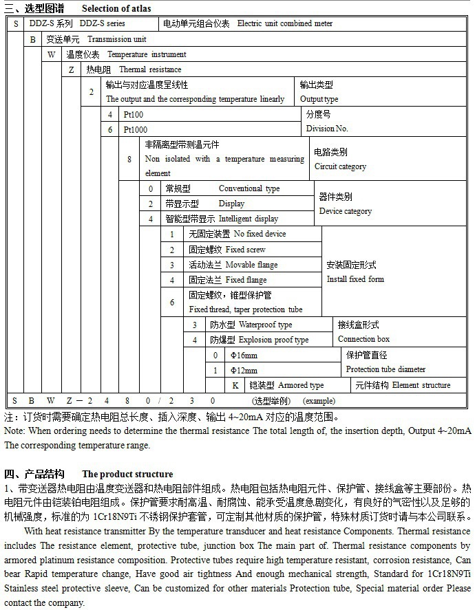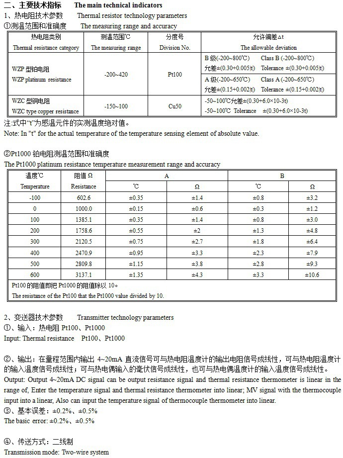 SBWZ series belt transmitter integrated thermal resistance Is DDZ-S Series In the meter Site installation type Temperature transmitter unit. It sets the transmitter with thermal resistance as a whole, Direct measurement of various industrial processes -200~+420℃ Within the scope of Liquid, steam and gas medium temperature, The temperature will be converted to And the thermal resistance of electrical signal proportional to the 4~20mA The uniform output signal, Sent to the display, recording adjusting instrument or computer. As a new generation of temperature transmitter,It can be widely used in llurgy, petroleum, chemical, electric power, light industry, textile, food, defense And scientific research departments.