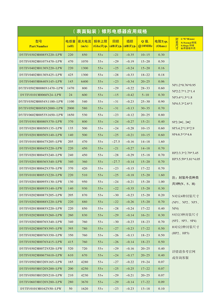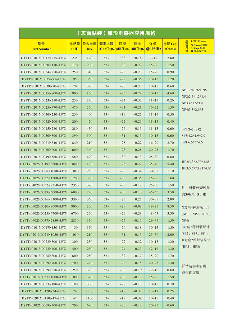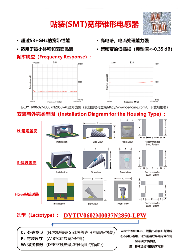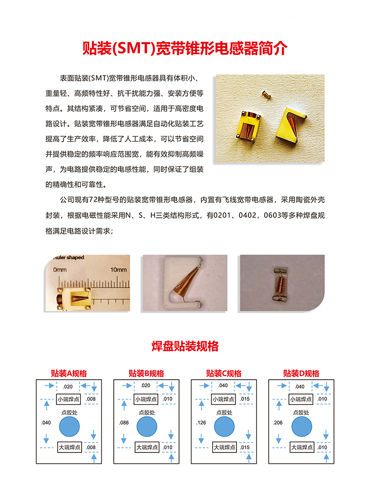 我公司提供各种尺寸、大电流范围和宽带频率范围的两种类宽带锥形电感器:飞线和SMT(表面贴装)的宽带锥形电感器。