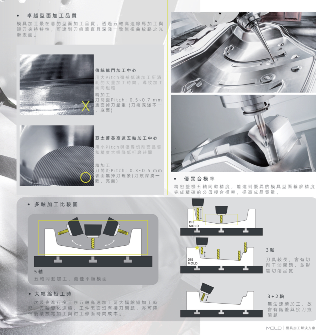 B、C轴回转的二轴头以高扭力的直驱马达(Direct Drive Motor)直接驱动,小体积外型适合复杂曲面加工与低误差、高转速等优点。