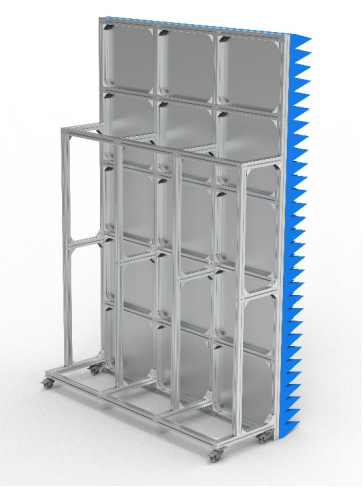 可移动吸波龙骨框架采用40*40mm铝型材龙骨框架结构形式,铝型材表面做喷砂氧化处理,可保证15-20年表面不腐蚀,整体铝型材结构使用螺栓穿孔中心连接,形成网格式结构框架,整体重量比钢结构轻便并且牢固耐用,提高了吸波屏风的整体稳定性,使用寿命可达30年以上,后期如需改动,铝型材可以拆卸再利用或者作为废铝回收价值也是客观的。