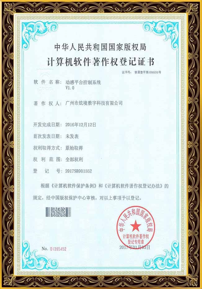 作为国内先应用4D仿真技术、三维技术等高新技术从事开发生产科普娱乐性产品,炫境数字科技率先推出了拥有自主知识产权的5D影院、7D互动影院等产品,先后获得“实用新型专利证书”、“外观设计专利证书”、“四维影片著作权专利证书”等多项荣誉。广州炫境数字科技以锐意进取、精工制造、科技创新、诚实守信的姿态不断发展、壮大。现已在全国多地建立运营中心: