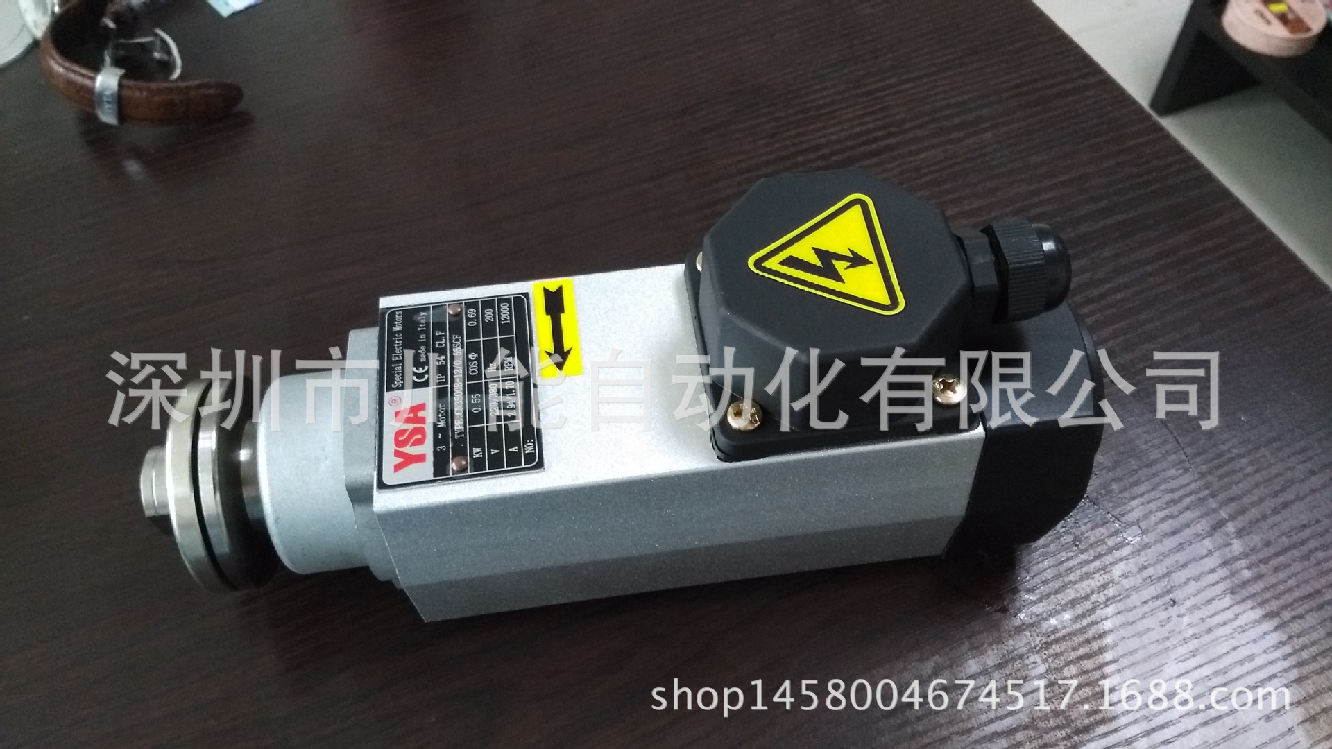 一、使用说明 1、选择变频器应与电主轴的电压、功率、频率相匹配来配套使用。设置变频器 首先设置变频器的基 准频率,变频器的基准频率按电主轴的高频率值 2、将变频器与电主轴三相电源连接,其中变频器的三相电源线应焊在插头 1 (U1)、2(V1)、3(W1)脚上,4脚为地线。然后变频器与外接电源连接。接通电 源后变频器点动,观察电主轴的旋转方向是否与电主轴指示方向一致,如旋转 方向不一致应立即关机改正,电主轴严禁在错误的旋转方向上运转。电主轴与 变频器连线不宜超过25m。 3、 由于精密角接触球轴承油脂润滑的极限转速的限制,电主轴不允许超速运行。 超速运行会造成精密角接触球轴承烧坏。 4、 电主轴正常工作时做好一听,二摸,三看三个环节。一听电主轴有无异常声出 现,发现异常声应及时关机检查。二摸电主轴发热、振动是否稳定,若发热、 振动加剧及时关机检查。三看被加工的表面质量是否稳定,如不稳定及时关机 检查。二、维护和保养 1、电主轴运行时发现声音或振动异常时,应立即停机检查轴承,必要时须更换新 轴承。当运行中发出异常气味或突然停转,应立即切断电源,用摇表测量定子 对地电阻及三相电阻,绝缘电阻丧失为定子烧坏,应回厂更换定子。 2、电主轴停用时间较长时,应用压缩空气将冷却管道中的残余冷却液吹干净,并 对电主轴进行防锈处理。电主轴存放或停用6个月后,须重新更换新油脂后方 可使用,否则将影响电主轴寿命。 3、为延长电主轴的使用寿命,新的电主轴或更换新轴承的电主轴应在转速 范围 内均分4~8档,每段运行30min后再升速,避免直接高速运转而缩短轴承的使 用寿命。在休假日后,开机使电主轴空载运转半小时后,再开始工作。 4、已损坏的电主轴须维修时,应回公司由我公司修理,本公司将竭诚为你服 务。