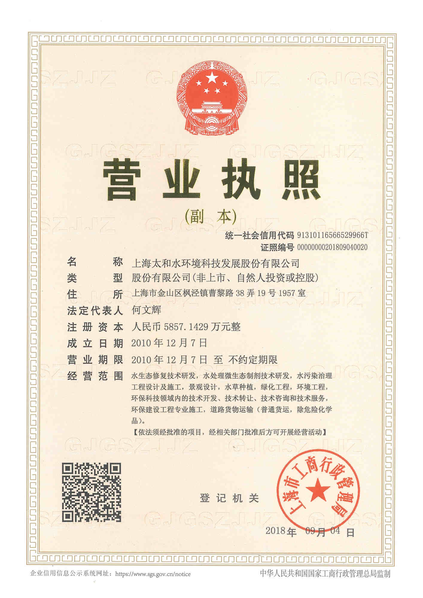上海太和水环境科技发展股份有限公司