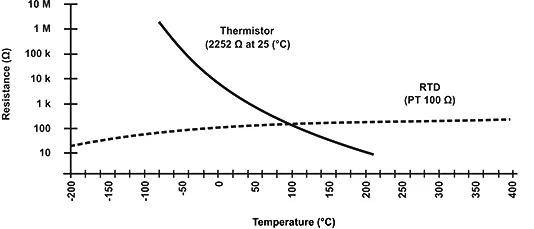 从图中可以看出,与铂合金RTD相比,NTC热敏电阻具有更陡的电阻 - 温度斜率,这转化为更好的温度灵敏度。即便如此,RTD仍然是最的传感器,其精度为测量温度的±0.5%,并且它们在-200°C和800°C之间的温度范围内使用,比NTC温度传感器的范围宽得多。