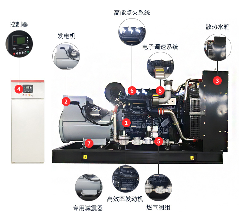 发电机组选用的发动机延续了康明斯/斯太尔/济柴的可靠性设计,采用高强度缸体,整体式曲轴以及高效润滑系统。同时我们根据燃气的物理特性对主要热负荷部件进行了重新设计,如缸盖,活塞,活塞环,进排气门,凸轮轴,排气管等。根据燃气种类重新设计了活塞压缩比,优化了配气相位,降低了发动机排温,确保了发动机的稳定功率输出,延长了发动机在高热负荷工况下的使用寿命。我们选用了国内外高性能点火系统(ECU)以及IMPCO比例式混合器。燃气通过MADAS稳压阀的整定可以有效的在气缸内被点燃,稀薄燃烧技术的利用,大幅降低了发动机的排放。