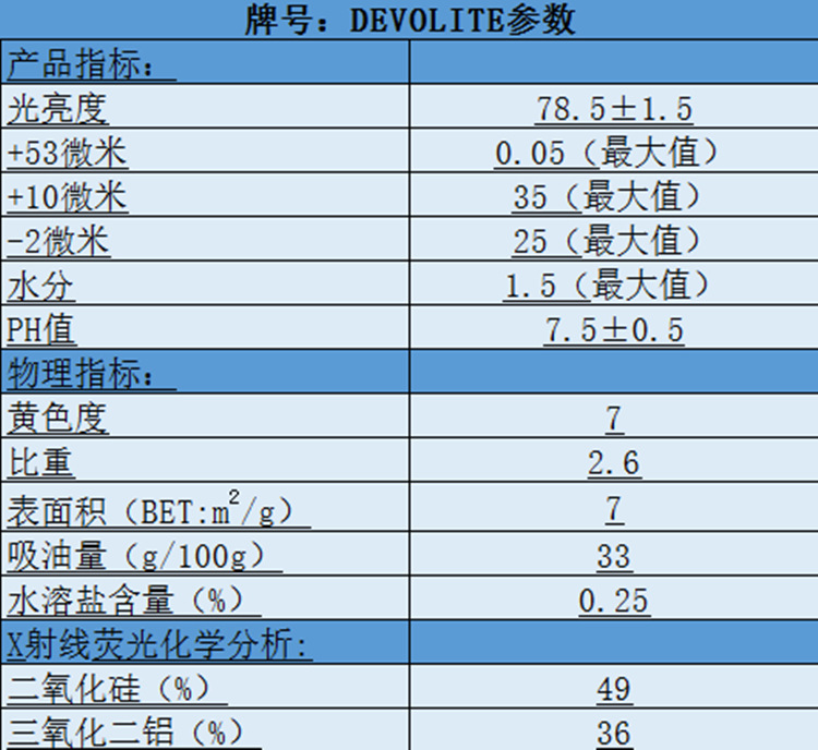 DEVOLITE是一种具有特殊预分数的英国高领土,在水性介质中极容易分散,碱性的PH值,无需添加悬浮剂,主要应用于金属包装中的密封胶生产。