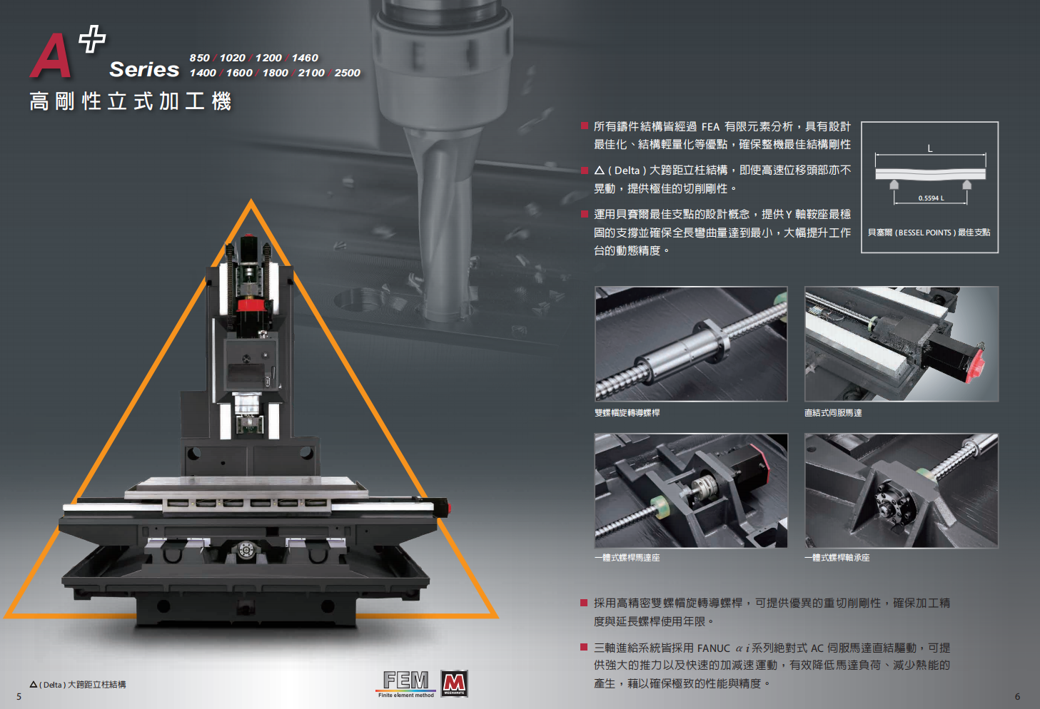 模組化的主軸設計,提供不同的切削特性。選擇齒輪式主軸,提供強悍的重切削能力。三軸全硬軌設計,經熱處理後再精密研磨,符合重切削應用所需的剛性需求。高效率 24T 刀臂式刀庫,換刀迅速且具備極高的可靠度。完整的系列機型,X 軸行程 850 ~ 2,500 mm ; Y / Z 軸行程 600 ~ 1,000 mm,滿足各種工件尺寸之加工應用。結構設計所有鑄件結構皆經過 FEA 有限元素分析,具有設計化、結構輕量化等優點,確保整機結構剛性△ ( Delta ) 大跨距立柱結構,即使速位移頭部亦不晃動,提供極佳的切削剛性。運用貝賽爾支點的設計概念,提供 Y 軸鞍座穩固的支撐並確保全長彎曲量達到小,大幅提升工作台的動態精度。