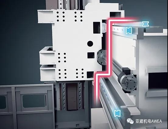 中心对称式主轴系统:将主轴、马达、滚珠螺杆、双配重油压缸与齿轮箱做空间配置,有效抑制热变位与减低不平衡力矩的产生,确保加工精度与重切削能力。