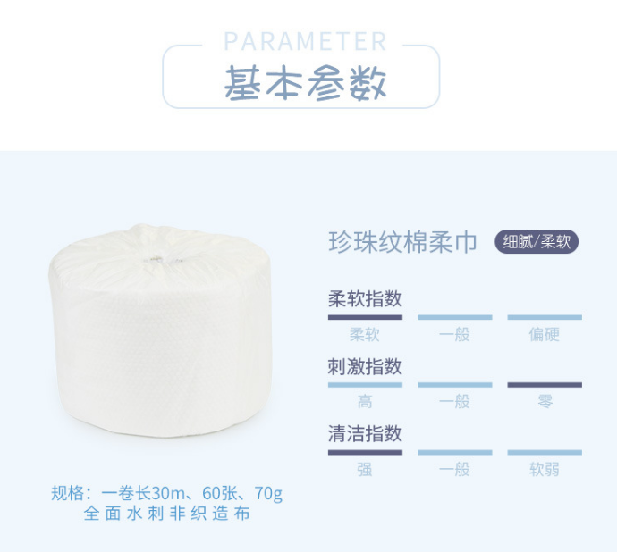 本品采用先进的全棉水刺无纺布工艺生产再经高压蒸汽灭菌处理后制作而成,具有柔软细腻、吸水性佳、不掉屑等特点,是纸巾、化妆棉、洗脸巾等产品的新环保型替代产品,同时不刺激皮肤,在擦拭时也不会有异物感,以及擦伤或刺痛的感觉。珍珠纹理设计在洁面时达到全方位无死角清洁面部,这样的设计让本品吸水性达到优良程度。不仅吸水性好,吸水速度也很快。洁面时,能够推开并且擦拭掉脸上出油,灰尘,以及分泌物等脏物。除了吸水性能好,也比较容易干燥,本品晾干之后可以擦拭物品桌面等,即使用了数次也不变形,不抽丝。