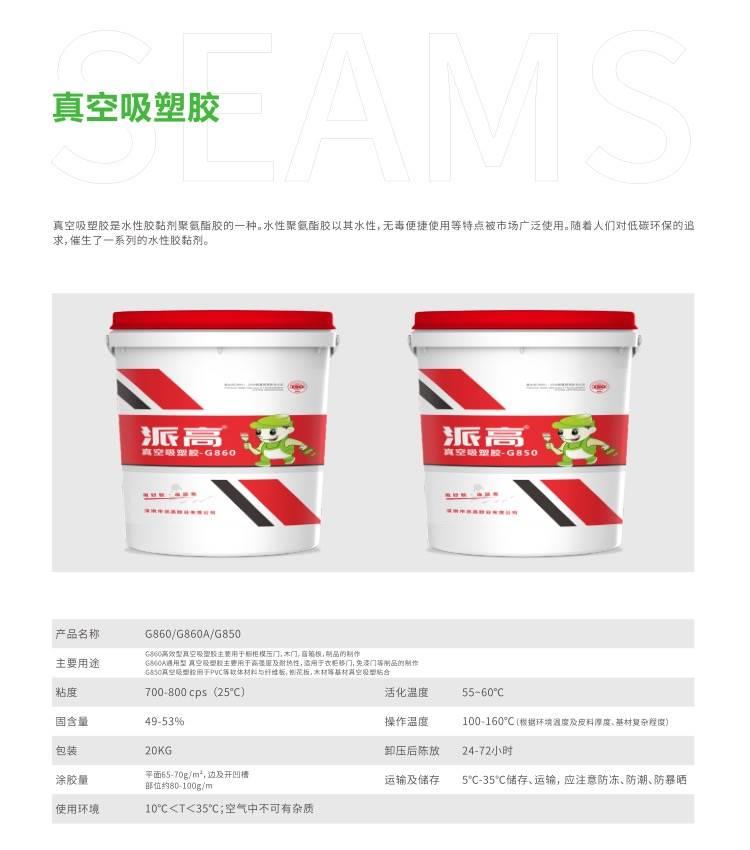 适用于中纤板或其它木制品与PVC胶皮之间的热吸。一种适用于真空吸塑成型的水基胶粘剂,它具有塑粘合,很强的初粘力,非常高的终粘接强度和良好的耐热性能。所有的原料均符合FDA(美国食品及药品协会)条规21CFR 175.105“粘合剂”