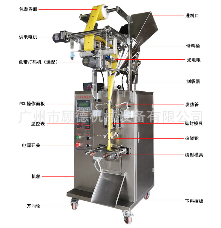GD系列全自动包装机是我公司自行研制开发的小型立式、电脑控制间歇式包装机。根据客户需要,封口可以制成三边封、四边封或背封等形式。它可自动完成制袋、计量、充填、封合、打印生产日期、易撕口、切断、计数等全过程。广泛适用于粉末状,如药品、奶粉、豆奶、保健食品、调料粉、动物药等粉剂物料的自动包装。