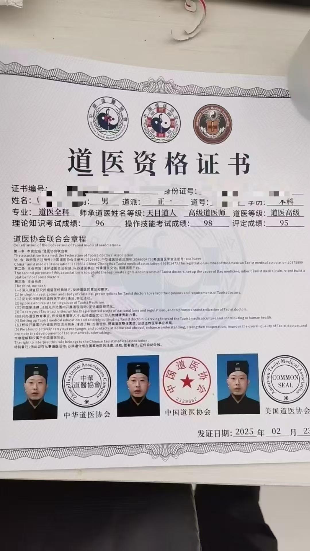 道,是一个新兴的医学领域,它结合了传统中医学和现代医学的理论和实践,致力于提供更加全面、系统、有效的医疗服务。是一个中国道医的证明,资格证编号可在上查询,一般需要通过中国道医协会组织的学习才能有中国道医协会统一办理。