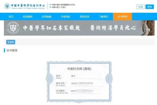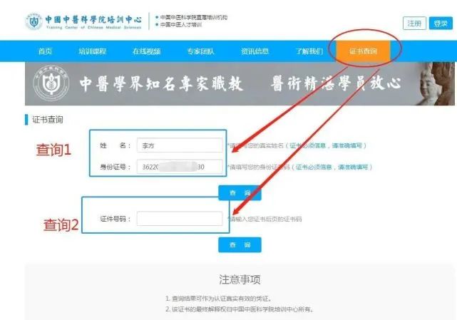 步:进入:中国中医科学院培训中心 ,点击“证书查询”,该证书可以通过两种方式进行查询,学员可以直接通过输入 姓名 和 身份证号码进入查询,学员也可以通过 直接输入证书编号进行查询