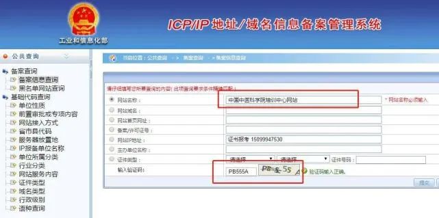 第二步:在备案管理系统里面,选择“网站名称”,输入“中国中医科学院培训中心网站”,然后输入验证码,点击,提交 即可查询,记住,只需要输入 网站名称 和验证码即可哦。