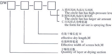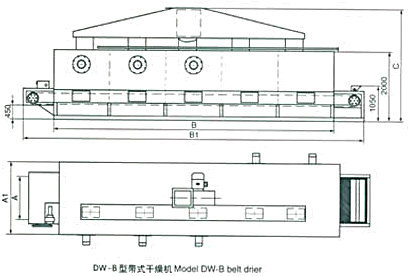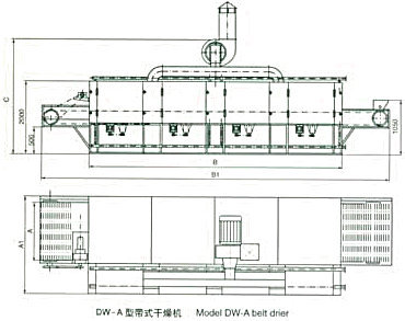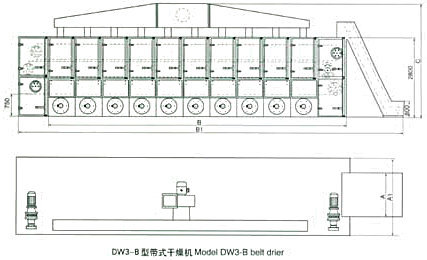 将需要处理的物料通过适当的布料机构,如星型布料机、摆动带、粉碎机或造粒机,分布在输送带上,输送带通过一个或几个加热单元组成的通道,每个加热单元均配有空气加热和循环系统,每一个通道有一个或几个排湿系统,在输送带通过时,热空气从上往下或从下往上通过输送带上的物料,从而使物料能均匀干燥。