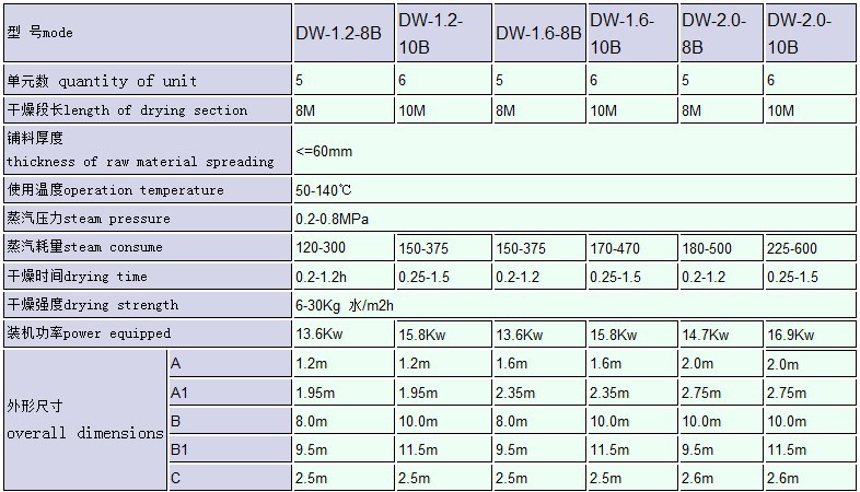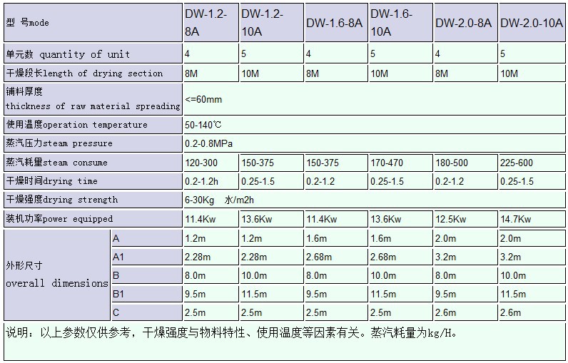说明:以上参数仅供参考,干燥强度与物料特性、使用温度等因素有关。蒸汽耗量为kg/H。