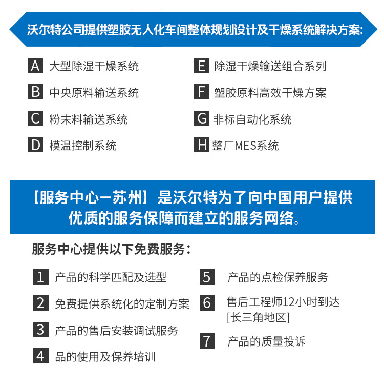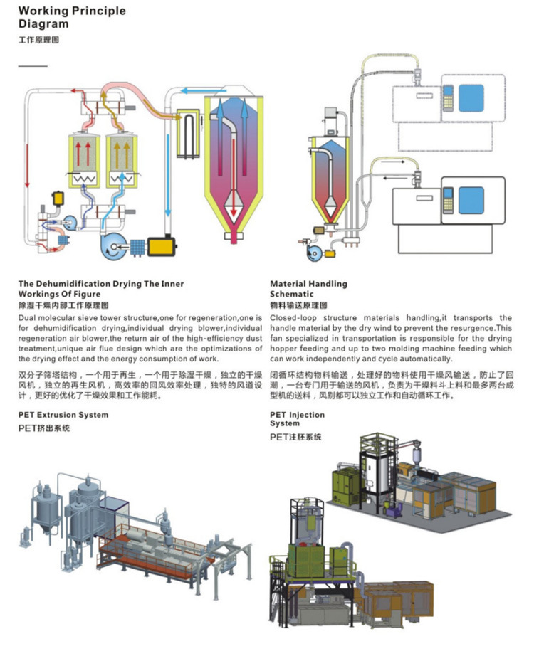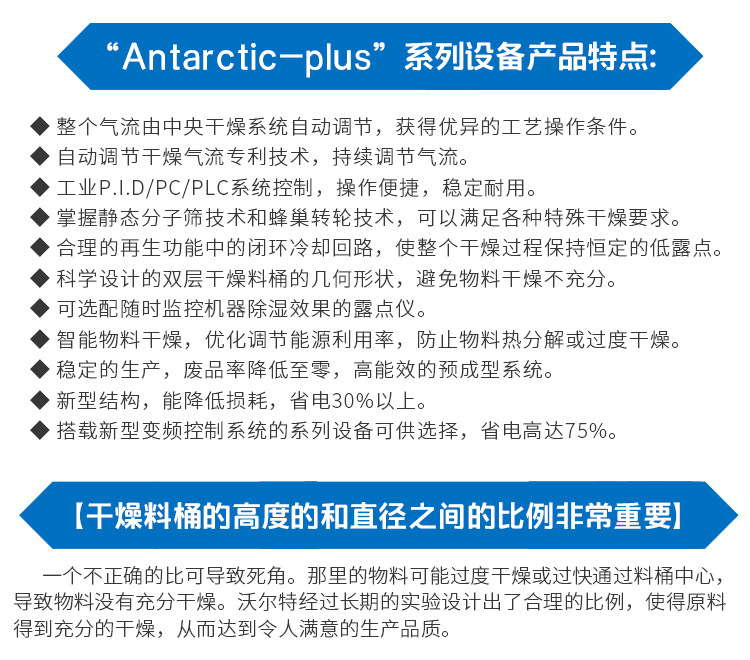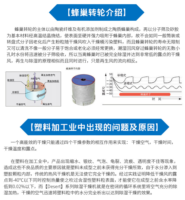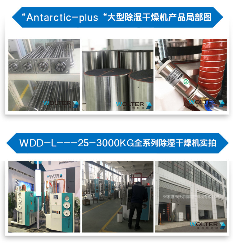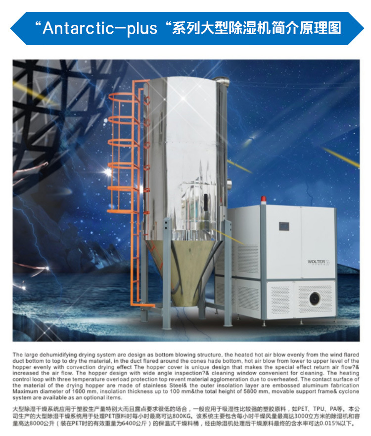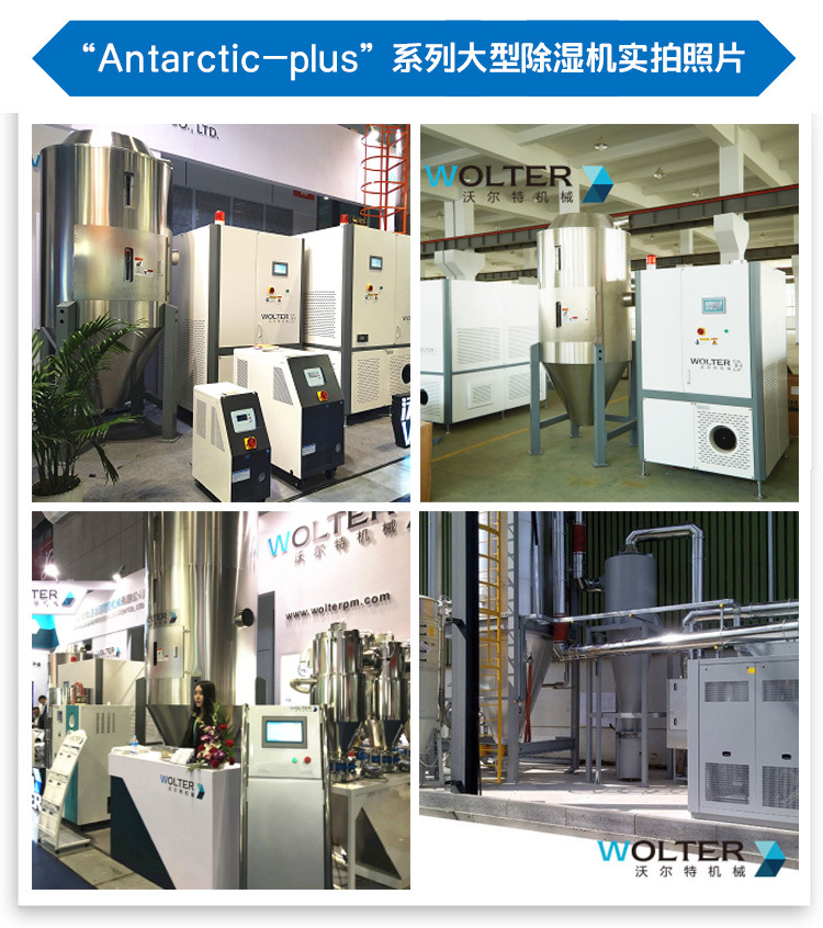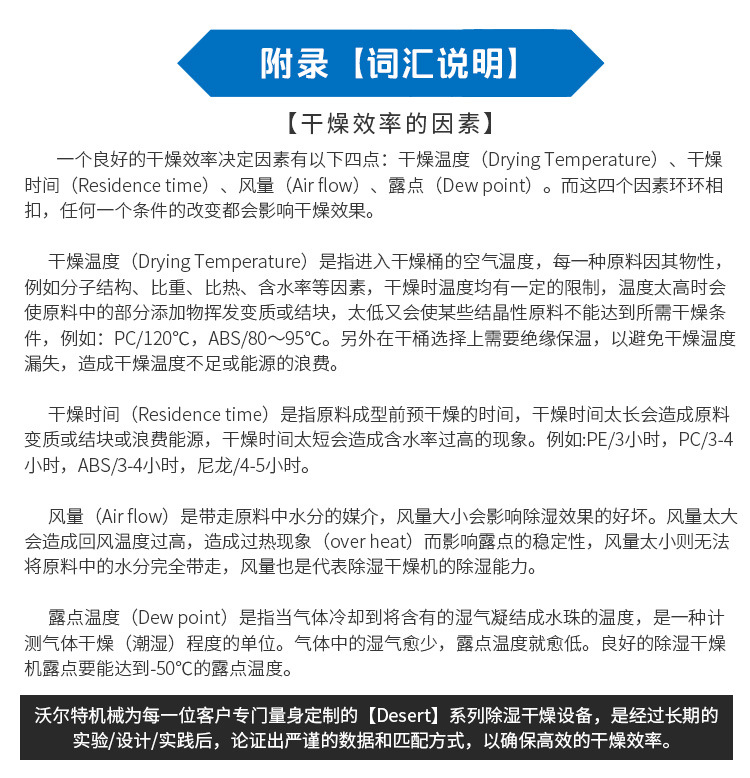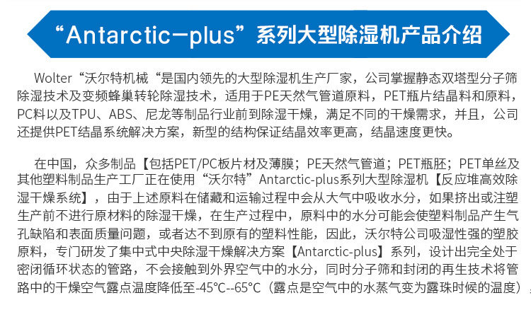 沃尔特公司针对于吸湿性高的工程塑料,专门研发了除湿干燥输送一体机【Desert】系列,设计出完全处于密闭循环状态的管路,不会接触到外界空气中的水分,同时分子筛和封闭的再生技术将管路中的干燥空气露点温度降低至-45℃(露点是空气中的水蒸气变为露珠时候的温度),低露点空气不仅可以塑料表面的水分得以蒸发并带走,而且还能去除塑料分子内部的结晶水,达到快速降低塑胶原料内部含水量的目的,适用于PC、PET、TPU、PA、PMMA、PTFE、POM、PE等颗粒状原料。