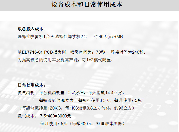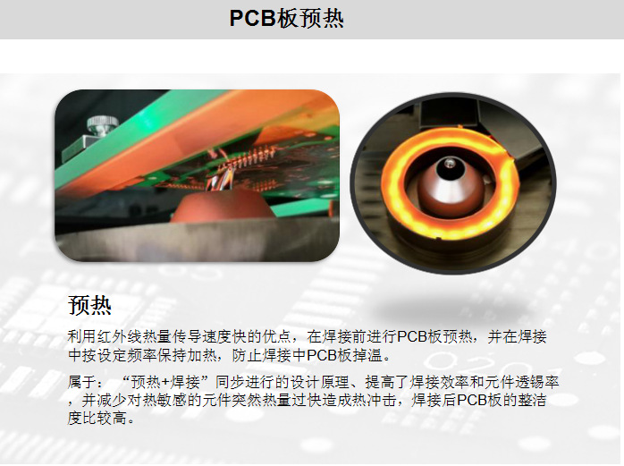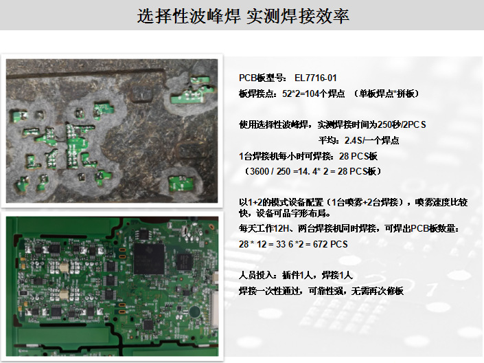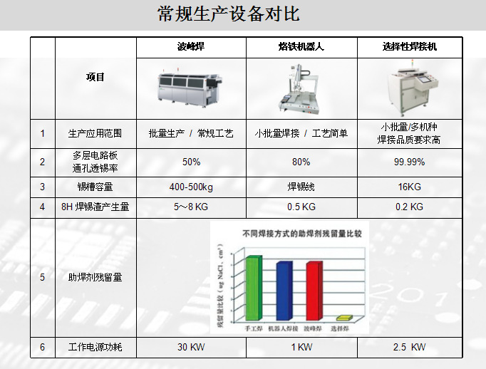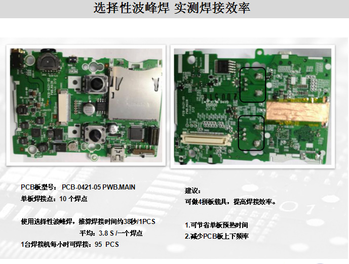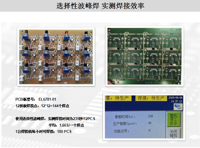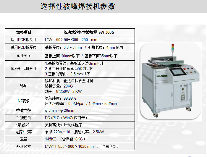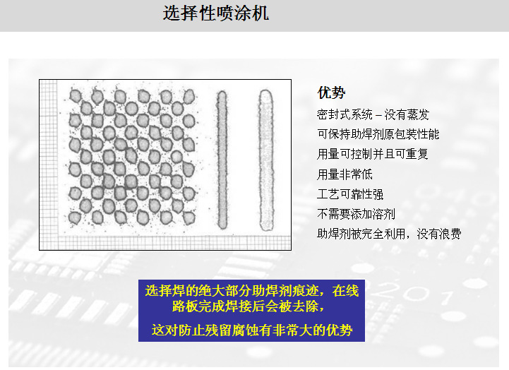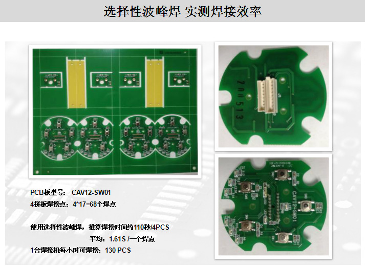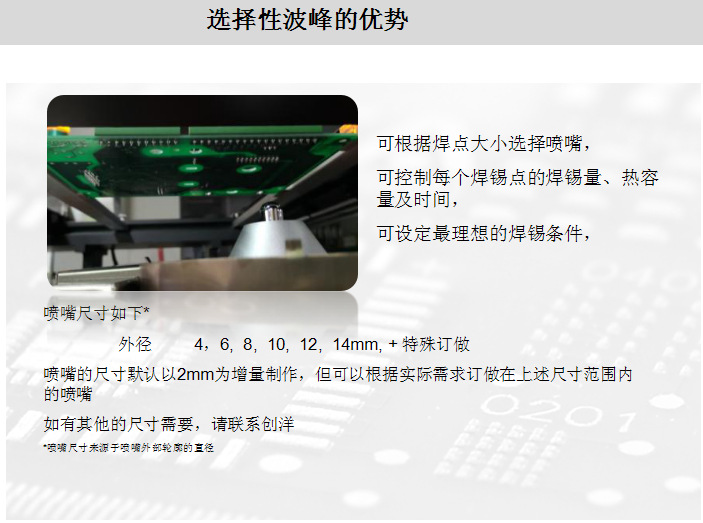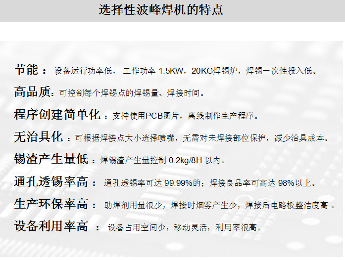 1.选择焊是利用熔融焊料,通过机械泵的推动,在氮气的保护下,利用循环流动的波峰与装有元器件的PCB焊接面相接触,以设定的速度及方向实现点焊或群焊。 2. 选择波峰焊具有焊接方式灵活、能耗低、焊料及助焊剂消耗少,透锡率高, 焊接质量稳定,节省焊接载具等特点。