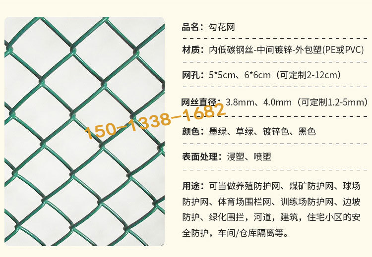 特点:网色鲜亮,抗老化能力强,耐腐蚀好的特点,规格齐全,网面平整,强力张紧,不易受外力撞击变形。现场施工安装,此网特点就是灵活性强,可根据现场要求随时调整造型和尺寸。